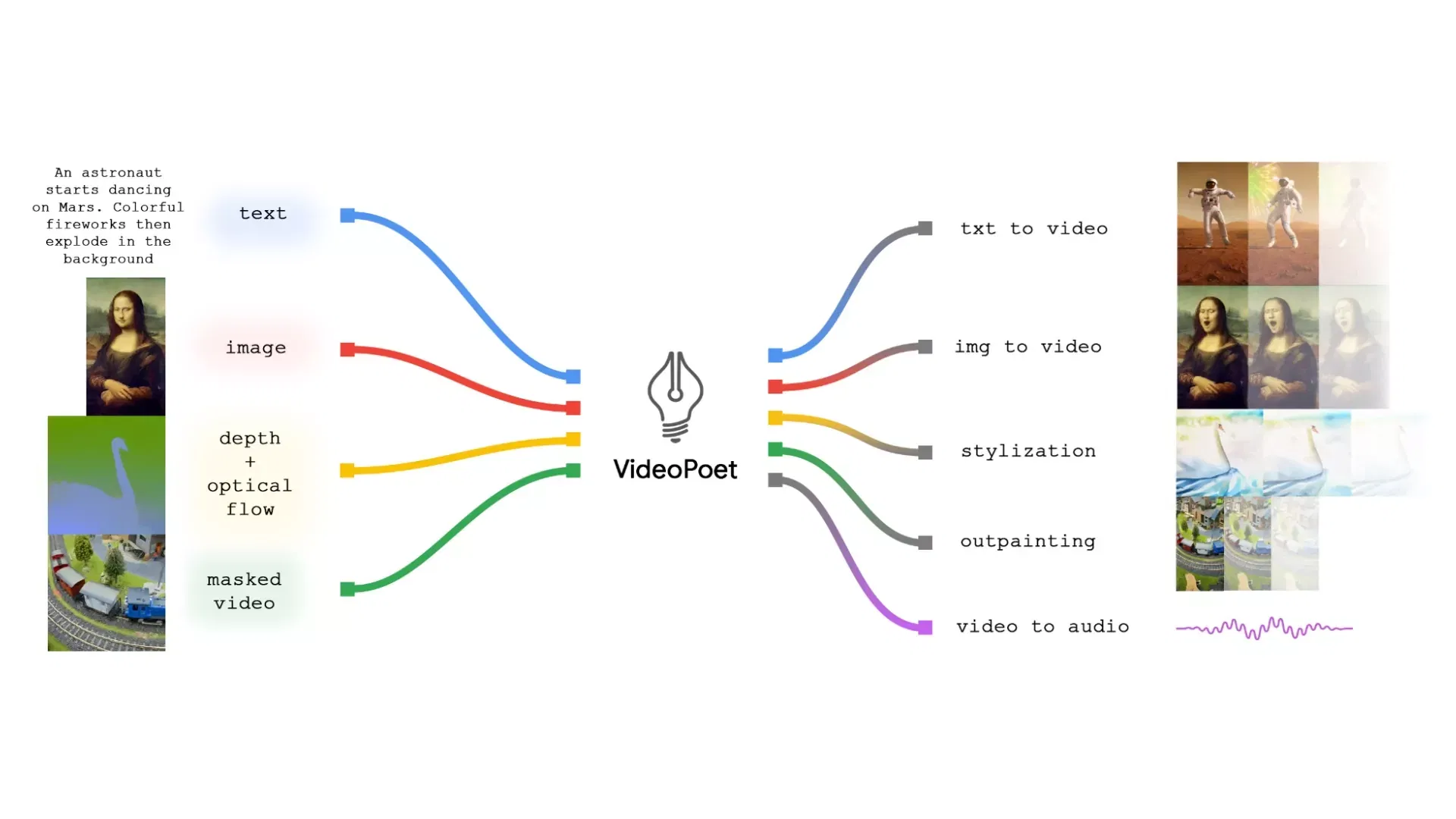 Basta descrivere una scena, anche estremamente fantasiosa, e in pochi secondi si otterrà un video pronto per la visualizzazione. Chi ha sperimentato generatori d'immagini basati sull'IA come Midjourney o DALL-E 3 conoscerà già la dinamica di VideoPoet, il quale può, inoltre, modificare contenuti video già esistenti, riempiendo vuoti o eseguendo altre manipolazioni richieste.