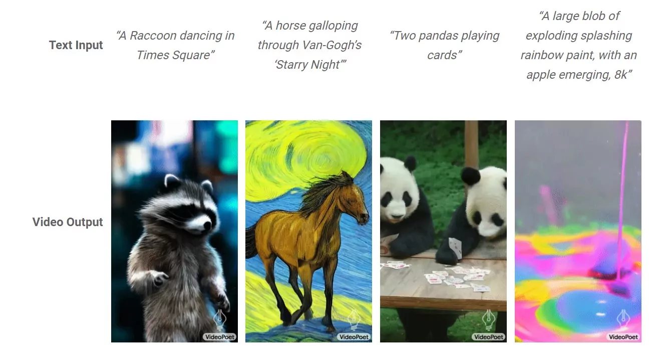 Google, nel corso del 2023, ha presentato l'innovativo PaLM 2 e i modelli linguistici Gemini, sottolineando la natura multimodale della sua intelligenza artificiale. VideoPoet, però, ha posto Google direttamente sul podio, in quanto è la prima grande azienda a presentare un'intelligenza artificiale in grado di generare video.