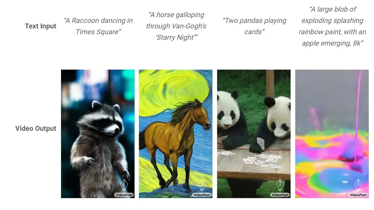 Le capacità di VideoPoet vanno oltre la generazione di video da testo, permettendo modifiche, applicazione di stili e cambiamenti di movimento su video esistenti. Google ha dimostrato la versatilità di VideoPoet con esempi di un procione che balla in vari stili.