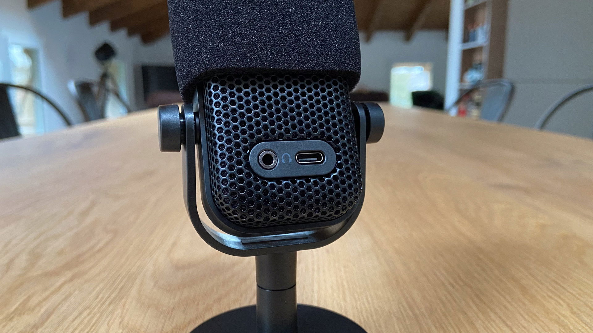 L’Endorfy Solum Voice S è costruito principalmente in plastica di buona qualità, dando una sensazione di solidità e robustezza. In confezione è presente un filtro anti-pop in schiuma, oltre a un cavo USB-C – USB-C da 2 metri e un adattatore da USB-C a USB-A. Sul retro del microfono ci sono la porta USB-C e un jack 3,5mm a cui collegare delle cuffie, sulla parte frontale è presente una manopola per la gestione del guadagno circondata da un LED RGB (si può scegliere tra 5 colori premendo la manopola), mentre sulla parte superiore c’è un tasto touch per silenziare il microfono.
