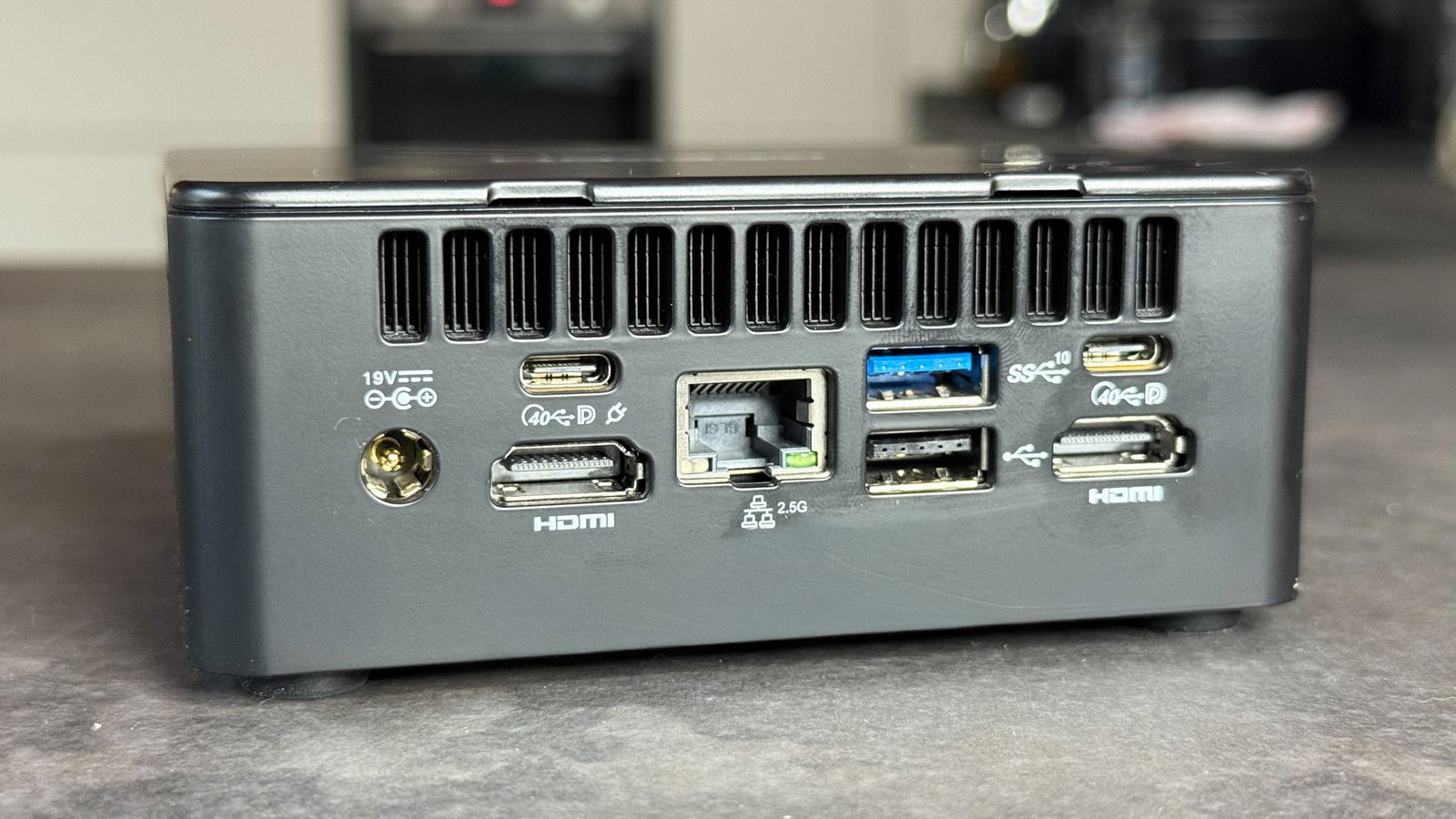La dotazione porte è molto buona considerando le dimensioni del dispositivo: sul retro ci sono due porte USB-C 4.0 (una delle quali supporta Power Delivery), due USB-A, due uscite HDMI 2.0, porta Ethernet da 2.5 Gbps e alimentazione. Frontalmente troviamo due porte USB 3.2 Gen2 Type-A e jack audio combo da 3.5mm, mentre sul lato sinistro c'è un lettore di schede SD, comodissimo per chi lavora con foto e video e vuole scaricali velocemente, senza dover passare per i classici adattatori. Una delle USB frontali supporta la ricarica di dispositivi anche a sistema spento, inoltre il sistema supporta fino a quattro display simultanei grazie alla combinazione di porte USB 4.0 e HDMI 2.0, con risoluzione massima 4K@60Hz per singolo monitor.