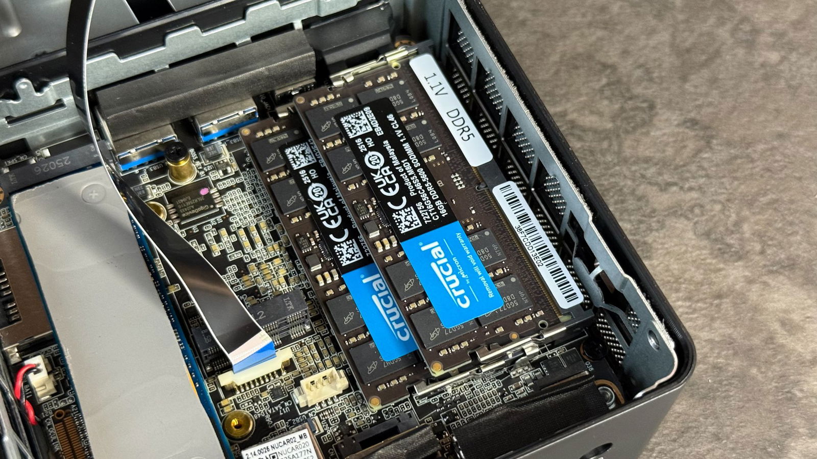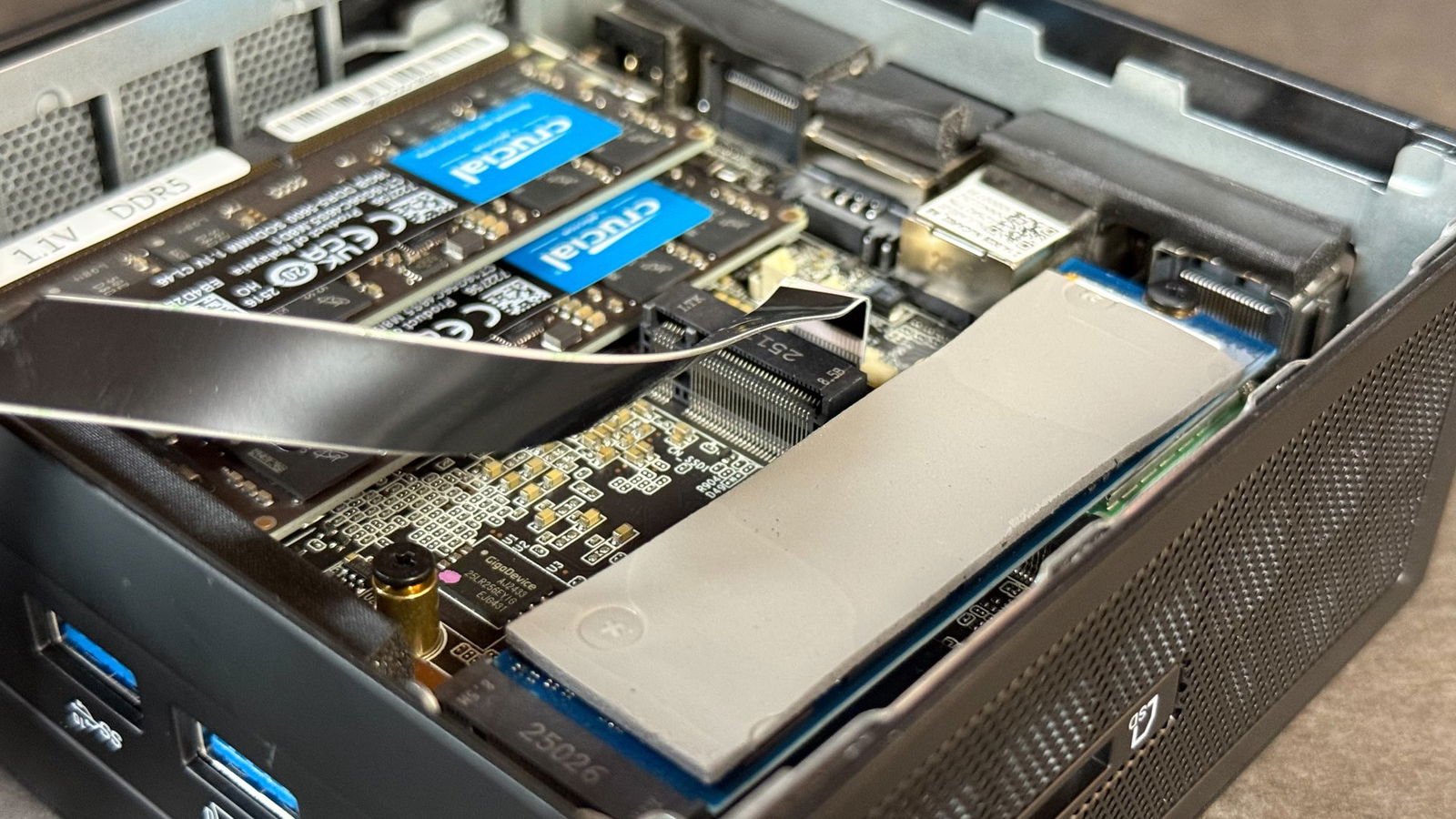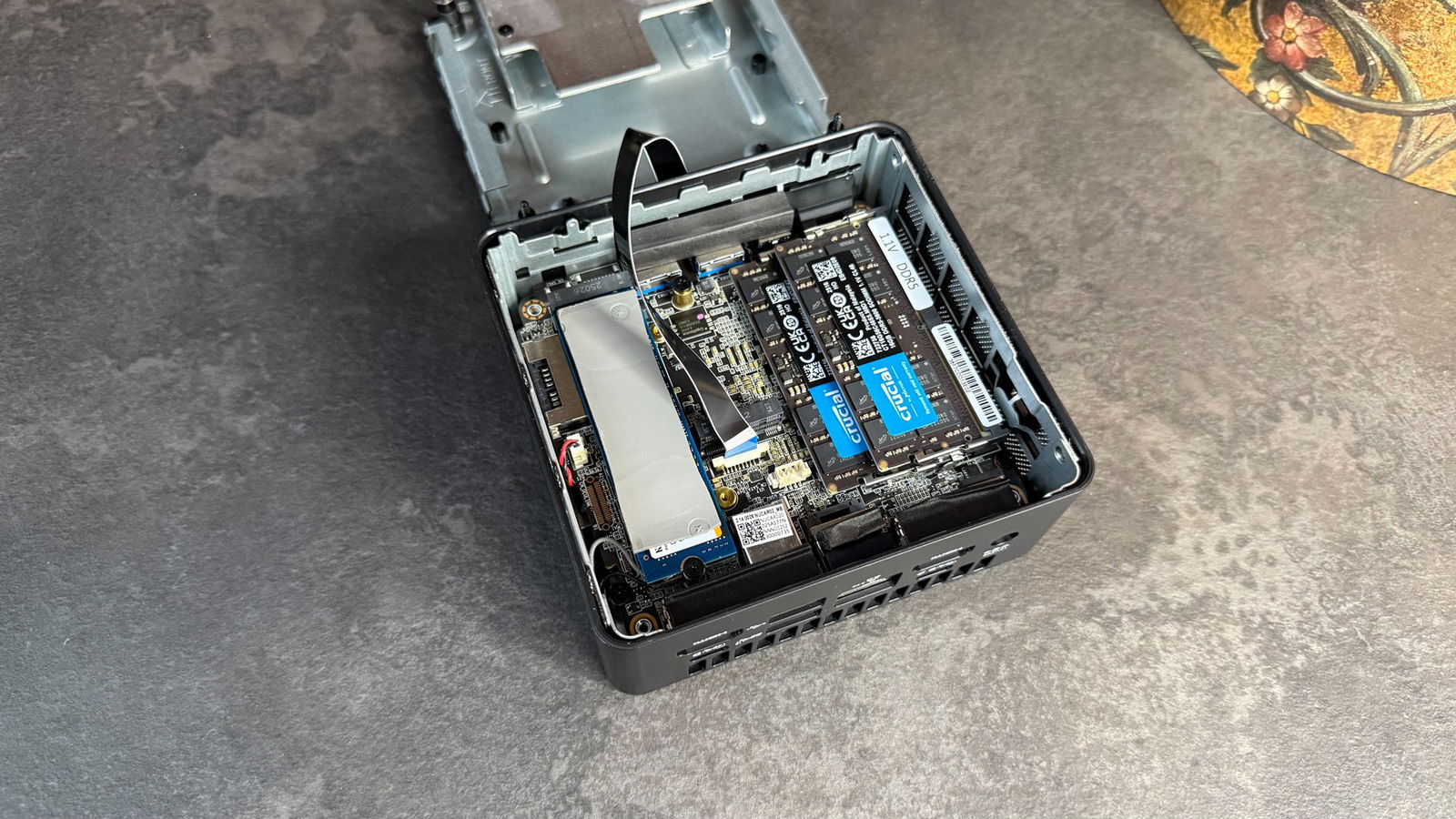 Parliamo brevemente anche delle possibilità di upgrade: come accennato è possibile aumentare la RAM a 64GB, ma è anche possibile aggiungere un secondo SSD M.2 in formato 2242 o un SSD SATA. Come in ogni mini PC che si rispetti, anche in questo caso è facilissimo accedere ai vari elementi: basta svitare le viti presenti nei quattro piedi e sollevare, facendo attenzione a non strappare il cavo flex. L'upgrade delle RAM e del SSD principale (dotato anche di pad termico) è immediato, mentre per accedere allo slot M.2 secondiamo bisogna fare i conti con il cavo flex.