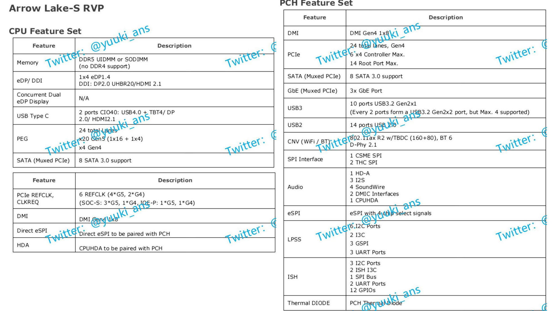In particolare, i processori Arrow Lake-S supporteranno 16 linee PCIe per le schede grafiche e due linee x4 per le unità SSD. La piattaforma include anche l'uscita DisplayPort a velocità UHB20 e i connettori Thunderbolt 4, a condizione che la scheda madre sia dotata di un appropriato rettificatore Hayden Bridge.
