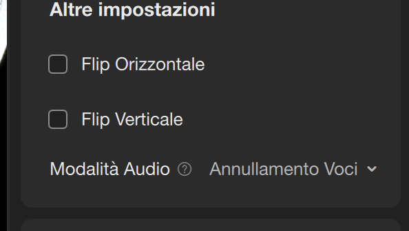 Nella tab “Altro” è possibile attivare il tracciamento dei gesti (attivazione tracciamento di gruppo, attivazione whiteboard e zoom), invertire l’immagine (sull’asse orizzontale e verticale) e scegliere la modalità audio. Per quest’ultima è possibile scegliere tra “Annullamento voci”, cioè una riduzione del rumore circostante, “Focus Voce” che attiva una riduzione del rumore più aggressiva e “Musica”, che dovrebbe mantenere un sottofondo musicale nel caso in cui stiate riproducendo della musica.