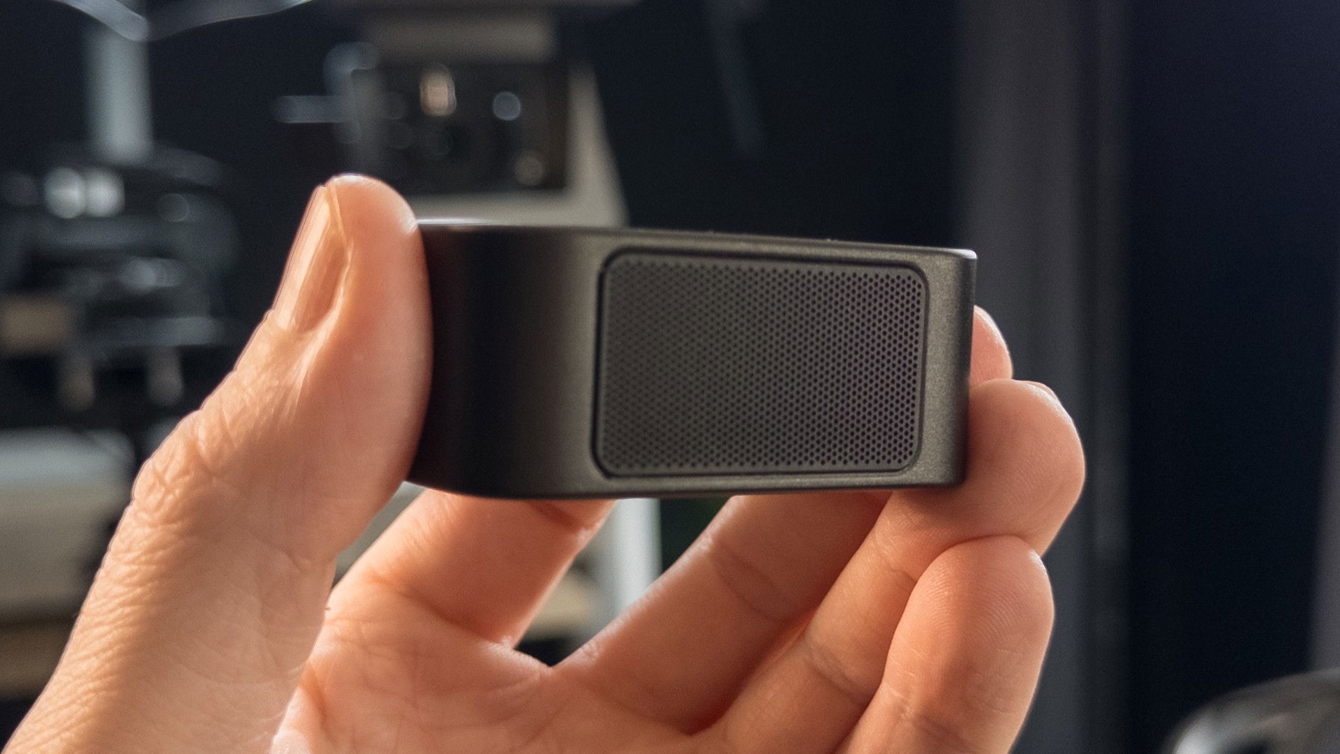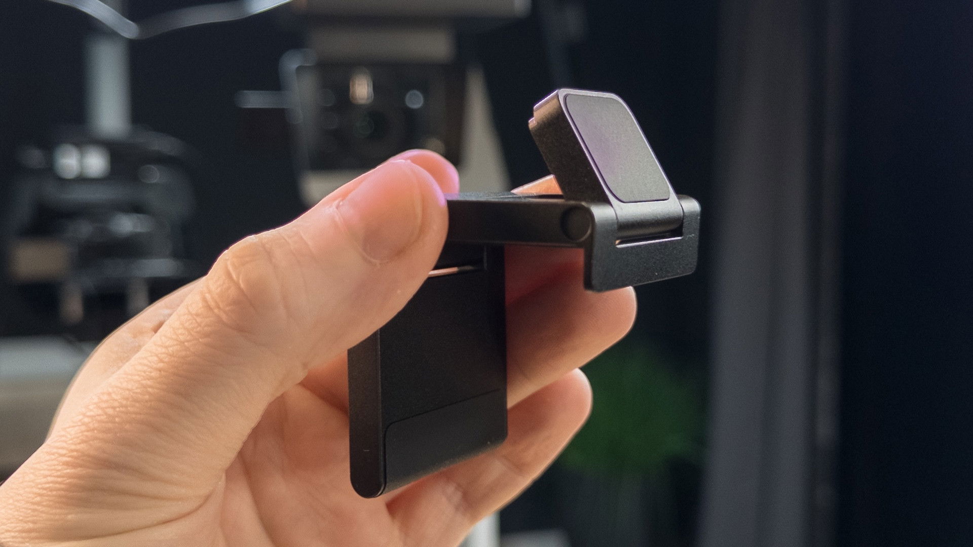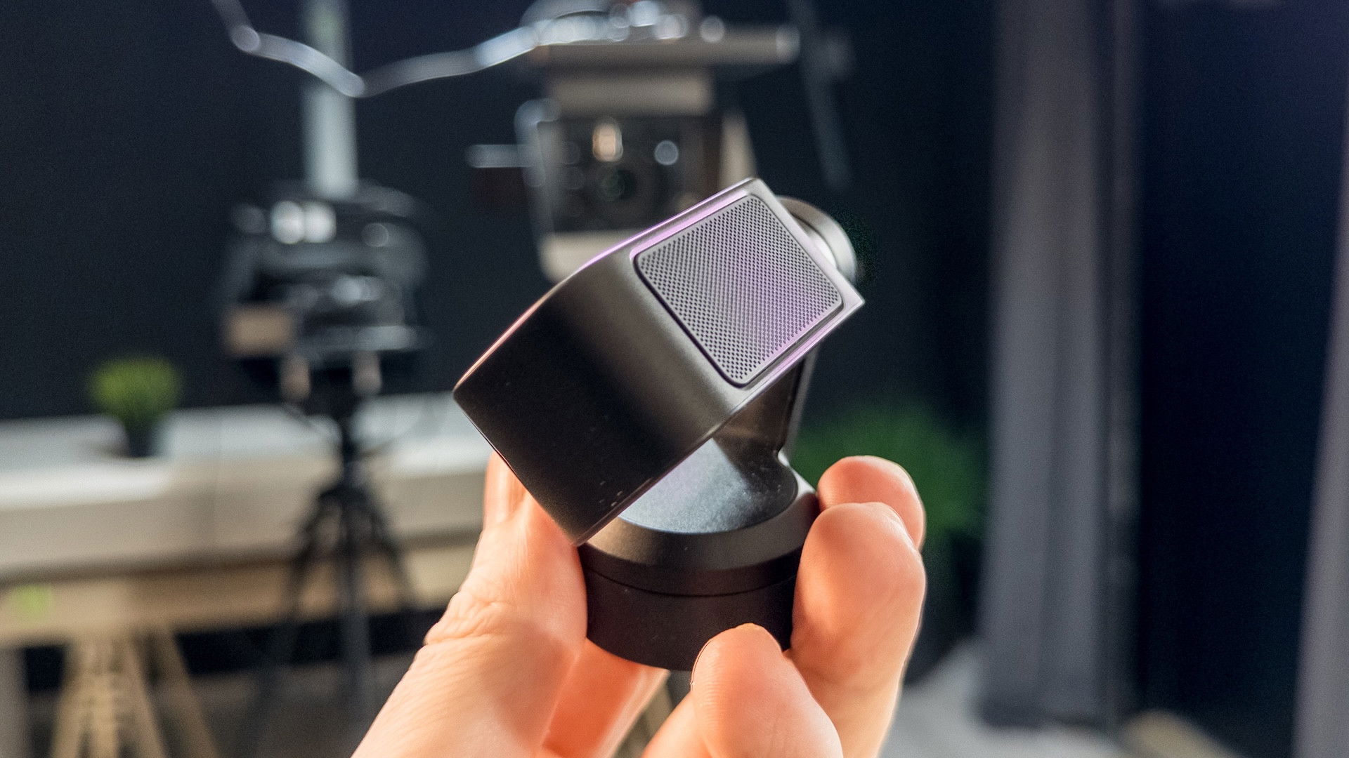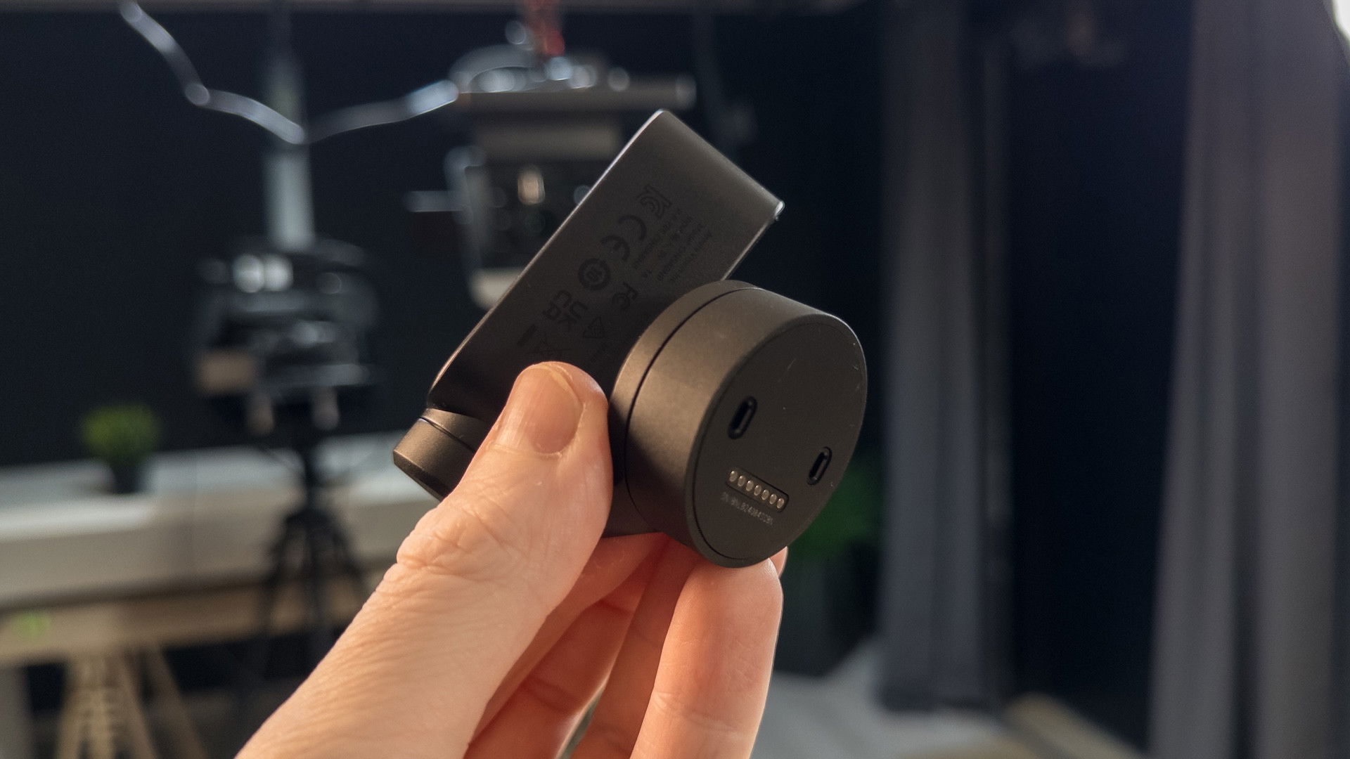 La clip è fatta in maniera tale da potersi agganciare alla cornice di un monitor, di inclinarsi a piacimento, o anche di essere installata su un cavalletto. Alla base del gimbal è presente un’area sensibile al tocco che permette di attivare e disattivare velocemente il tracciamento IA dell’immagine, e cioè la funzione che permetterà alla videocamera di muoversi in autonomia per tracciare una o più facce. Manca totalmente la possibilità di oscurare l’obiettivo, la classica “modalità privacy”, ma al suo posto potrete semplicemente ruotare la videocamera verso il basso. I microfoni sono posizionati sopra, nascosti dietro una griglia.