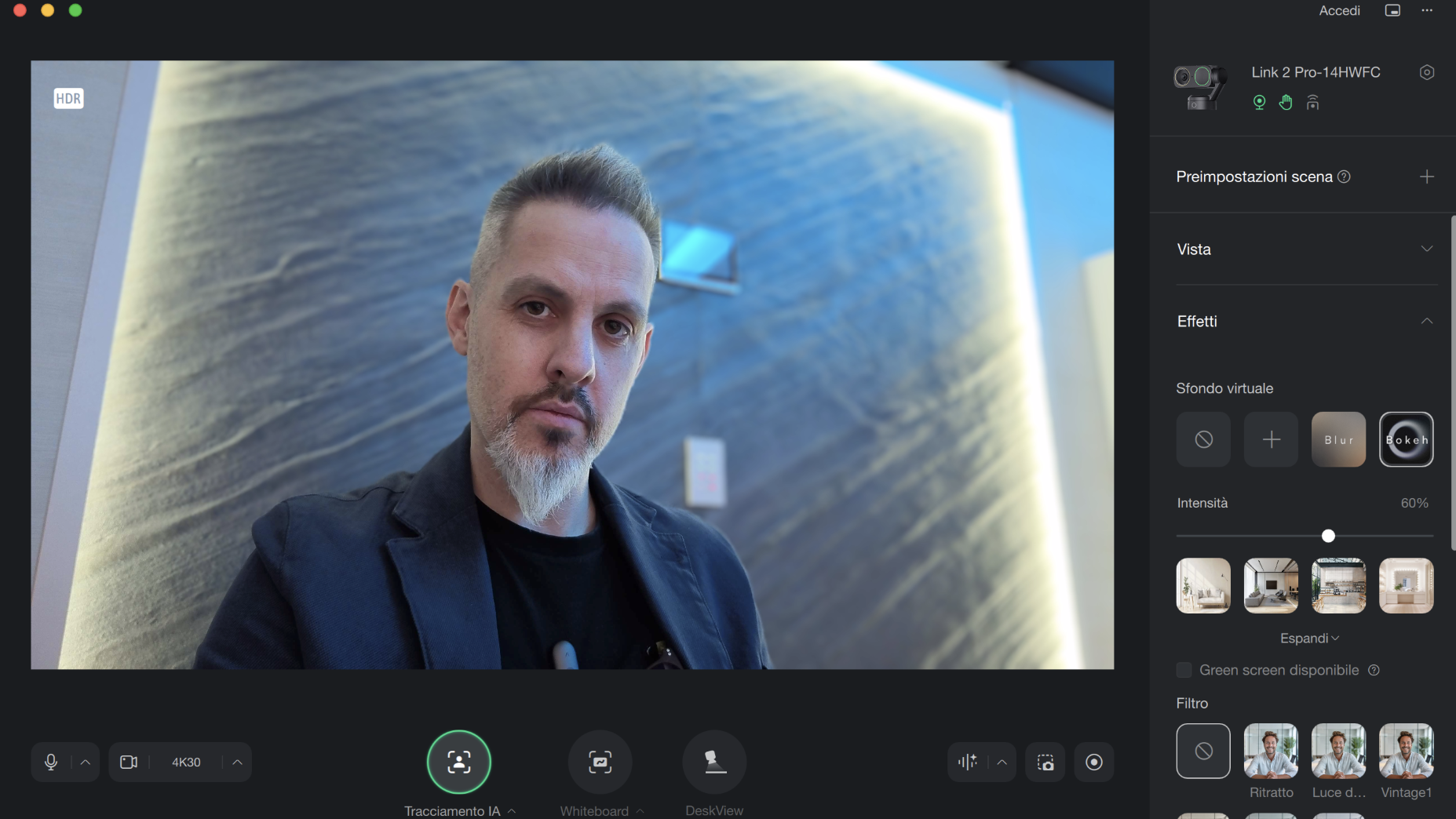 Le funzioni software complementari includono Desk View, che ruota virtualmente la prospettiva per mostrare il piano di lavoro restando in frame, utile quando bisogna mostrare documenti o oggetti senza dover tenere una seconda camera puntata verso il basso. Whiteboard Mode, che enfatizza la luminosità e il contrasto di quello che viene scritto su una lavagna o su un foglio, rendendo il testo leggibile anche se la luce ambientale non è ideale. La modalità ritratto 9:16 a 4K è utile per i content creator che producono per TikTok o Instagram , anche se richiedere il posizionamento fisico verticale su treppiedi.