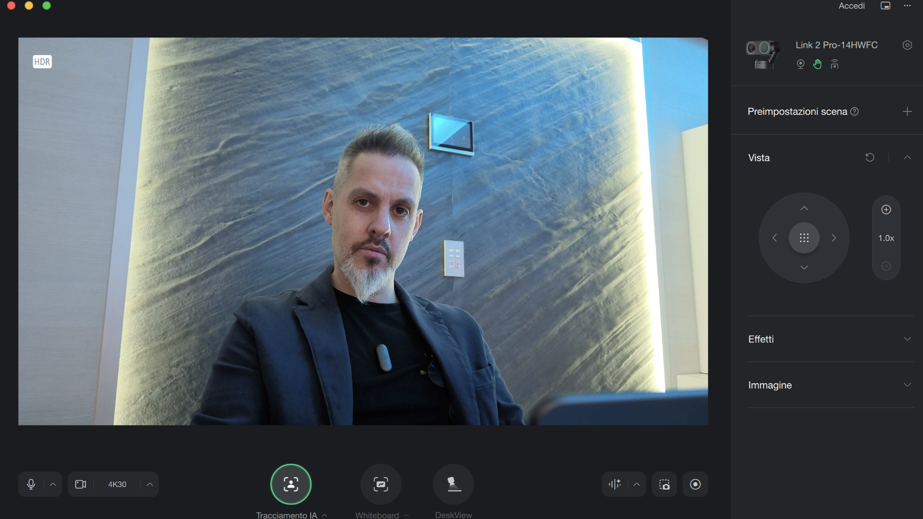 Il tracking tramite gimbal è fluido e risponde bene ai movimenti laterali o il cambio di profondità. L'intelligenza artificiale riconosce il volto e il corpo senza richiedere gesti di attivazione, anche se è possibile controllare il tracking tramite palmo aperto della mano davanti alla camera o tramite app quando si preferisce un controllo manuale. Al raggiungimeneto del limite della zona di tracciamento, il gimbal non compie scatti bruschi ma si arresta gradualmente, evitando quelle transizioni innaturali che troviamo su webcam con tracking puramente software. Abbiamo testato anche la modalità di tracking di gruppo, che mantiene in frame fino a tre persone simultaneamente: la camera allarga l'inquadratura e compensa il movimento collettivo piuttosto che seguire una singola persona.