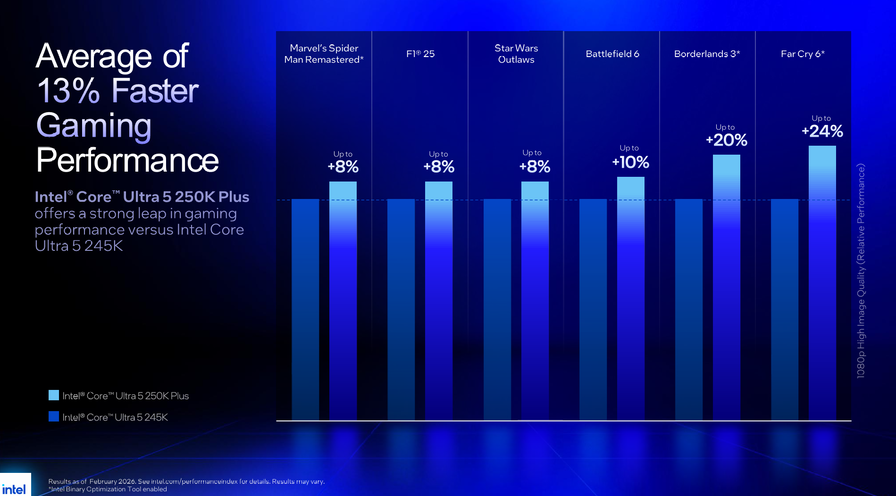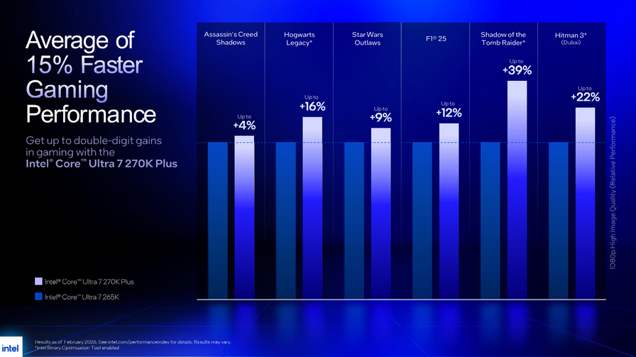 Sul fronte gaming a 1080p, i confronti sono con i predecessori diretti: il 270K Plus ottiene in media il +15% rispetto al 265K su un campione di titoli, con punte fino a +39% su Shadow of the Tomb Raider e +22% su Hitman 3 (entrambi con Binary Optimization Tool attivo). Il 250K Plus segna in media +13% rispetto al 245K, con i guadagni più marcati su Borderlands 3 (+20%) e Far Cry 6 (+24%).