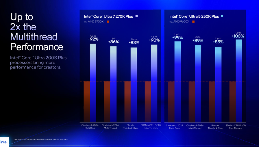 Nei benchmark sentitici multithread, Intel confronta i nuovi chip con i diretti concorrenti AMD: il 270K Plus segna fino a +92% su Cinebench 2024 e +90% su 3DMark CPU Profile Max Threads rispetto al Ryzen 7 9700X; il 250K Plus arriva fino a +103% sullo stesso benchmark contro il Ryzen 5 9600X.