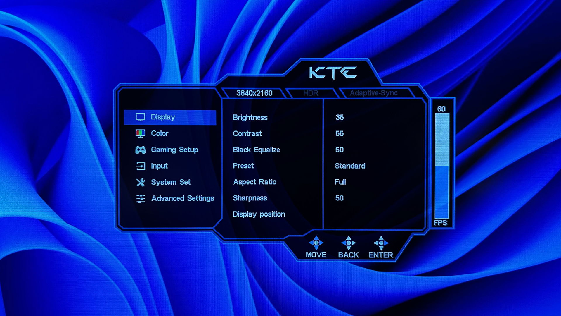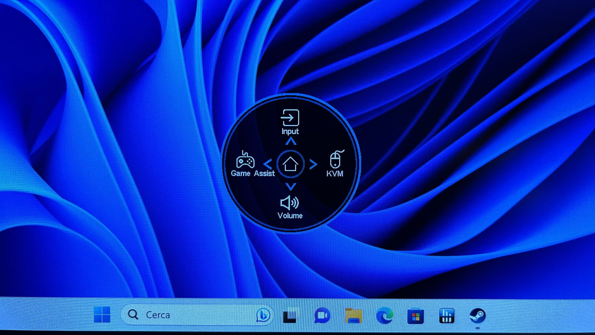 KTC ha installato un joystick nella parte inferiore centrale per controllare il menu OSD (proprio come sul monitor Asus). Un menu rapido circolare offre un accesso veloce alle impostazioni più importanti. Le opzioni complete sono disponibili tramite il menu principale, che è anch'esso controllabile dal telecomando, se vorrete. Potrete regolare i parametri tradizionali come luminosità e contrasto insieme ad altri parametri come il commutatore KVM, la funzione di overclocking (138 Hz) e altro. È possibile visualizzare anche un mirino o un visualizzatore di FPS.