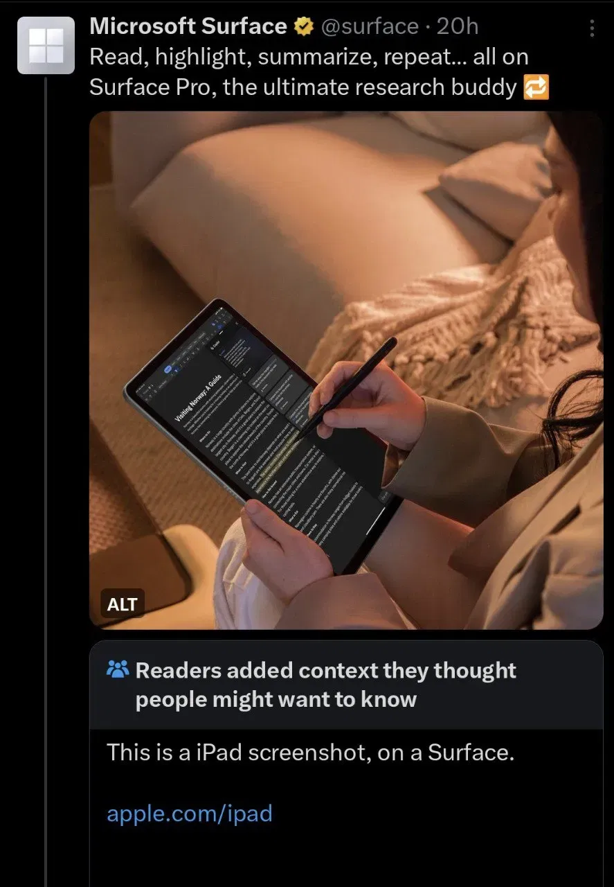 L'errore sembra essere frutto di un fotomontaggio mal riuscito, dove qualcuno ha sovrapposto un'immagine di Microsoft Word su uno screenshot di iPadOS senza preoccuparsi di rimuovere gli elementi caratteristici del sistema operativo Apple. La community di X non ha tardato a reagire con commenti taglienti come "Nemmeno Microsoft riesce a costringersi a usare Surface" e "Come fa un'azienda da mille miliardi di dollari a sbagliare così clamorosamente?". Il sistema di fact-checking collaborativo della piattaforma ha anche aggiunto una nota esplicativa per chiarire che Microsoft stava effettivamente usando iPadOS nella sua campagna pubblicitaria.