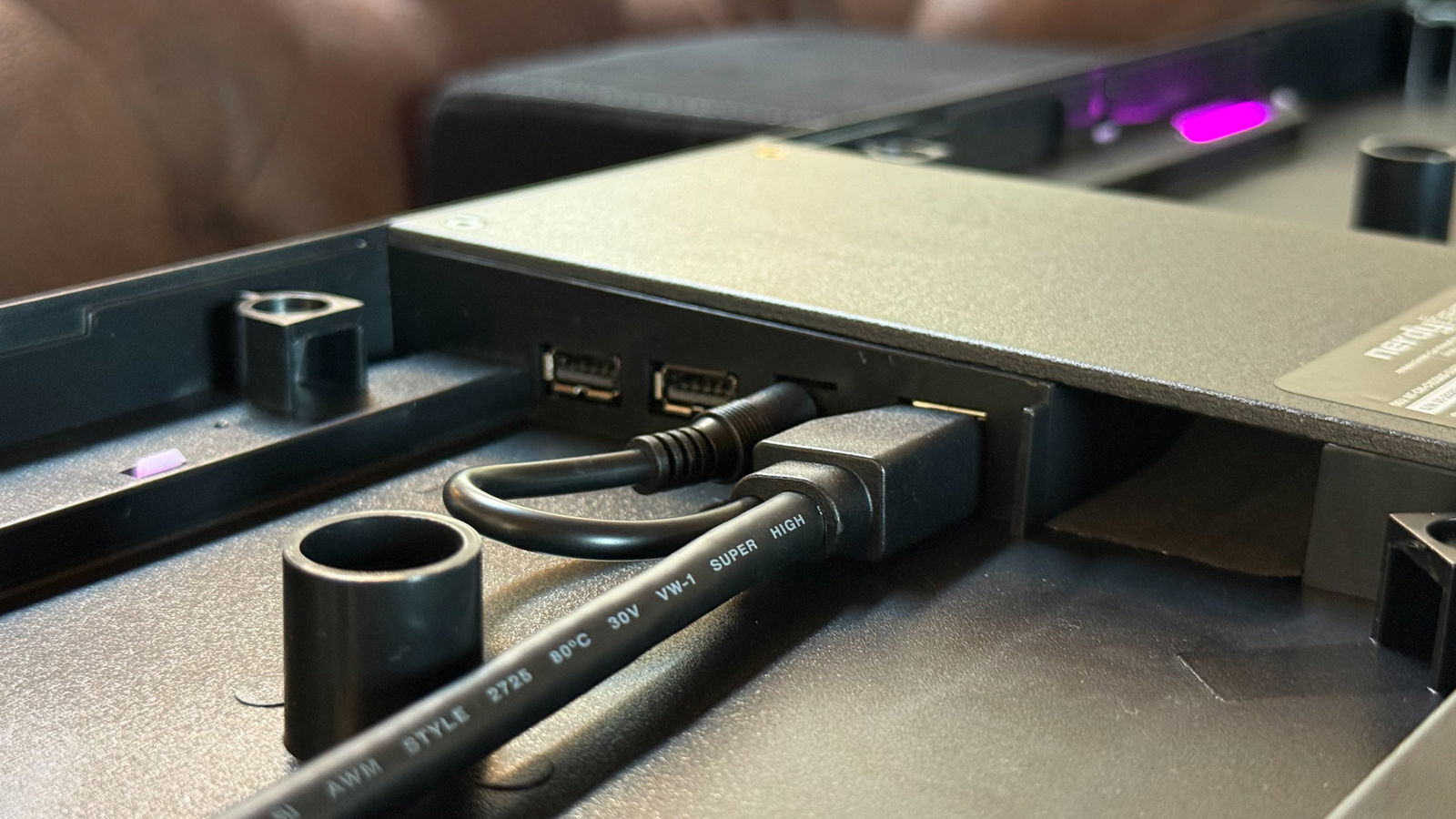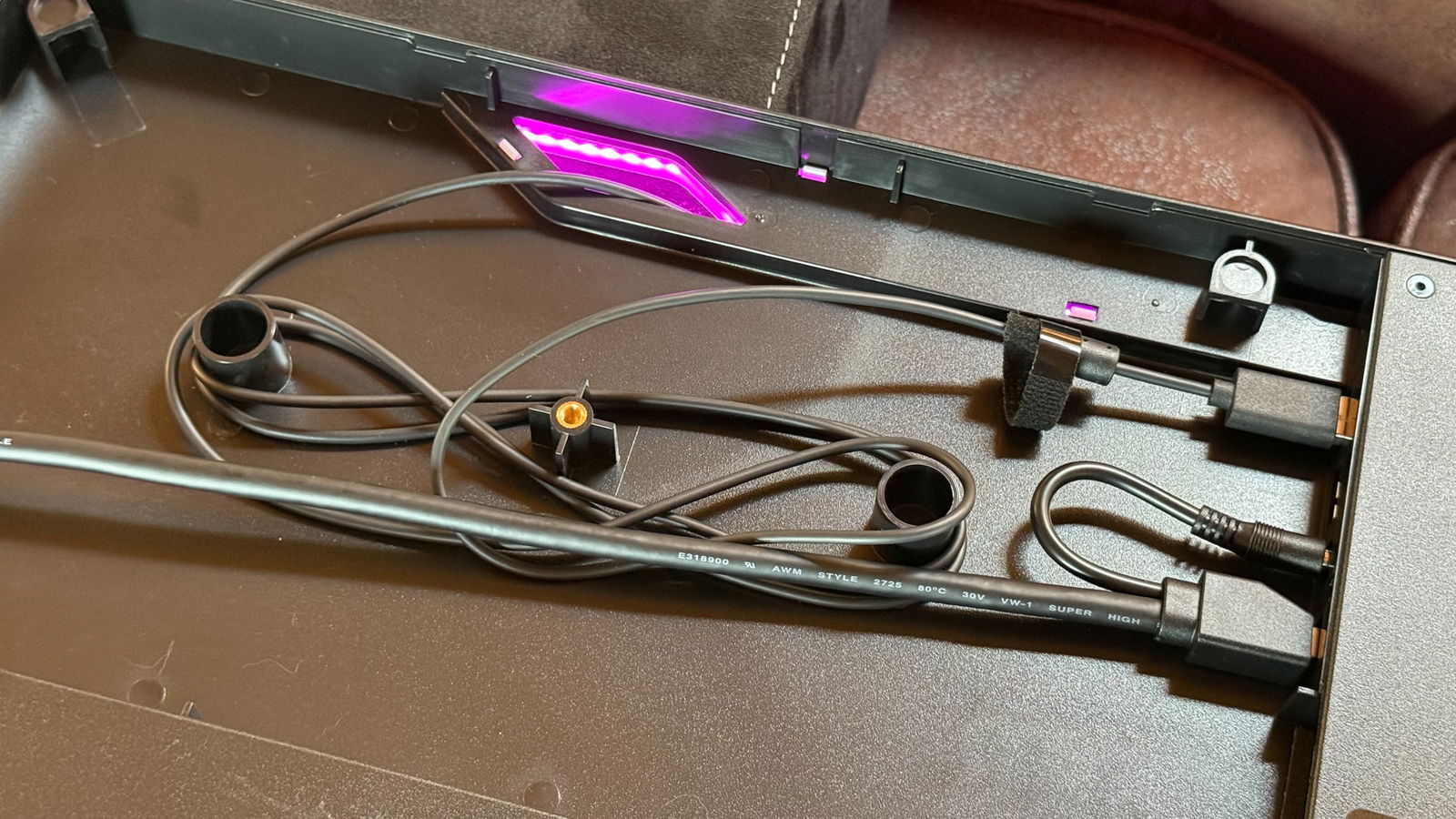 Questa fase richiede un po' di pazienza e pianificazione, poiché una disposizione ottimale dei cavi contribuisce significativamente alla praticità d'uso quotidiana (la documentazione inclusa offre alcune linee guida). Una volta collegati tutti i dispositivi, si chiudono i pannelli, si collega l'alimentatore esterno all'hub e il cavo principale al computer.
