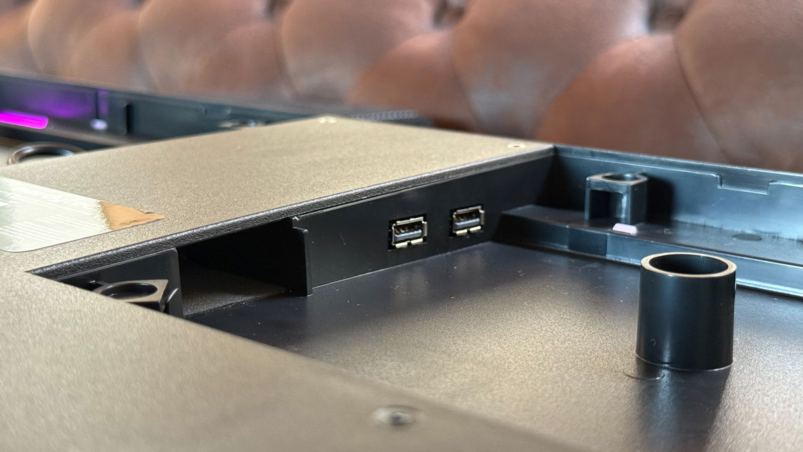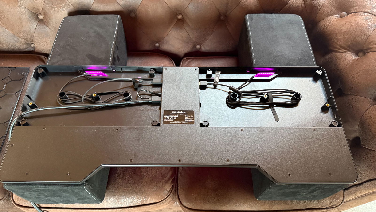 Il cuore del Couchmaster Cycon 3 è il suo hub USB 3.2 Gen 1 integrato direttamente nel piano di supporto. Questa soluzione elimina la necessità di adattatori esterni o multiprese, centralizzando tutta la connettività in un unico sistema organizzato. L'hub offre un totale di sei porte USB: quattro sono strategicamente nascoste sotto pannelli rimovibili sulla superficie del piano, ideali per connessioni permanenti come tastiera e mouse, mentre due porte (una USB-A standard e una USB-C) sono posizionate sopra, per collegare rapidamente smartphone, chiavette o altri dispositivi. I pannelli removibili si aprono facilmente tramite viti autofilettanti, consentendo di accedere facilmente alle porte USB interne e ai percorsi per i cavi. Una volta configurato, il sistema permette di avere un'area di lavoro praticamente priva di cavi visibili, con il solo cavo principale che collega l'hub al computer in uscita.