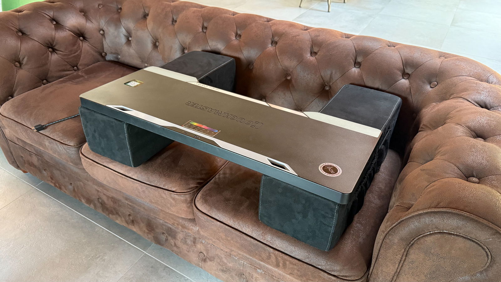 Il Couchmaster Cycon 3 si presenta con un design imponente ma elegante, frutto di un'attenta progettazione ergonomica. Il corpo principale è costituito da un piano di appoggio in plastica policarbonata riciclata al 100%, con dimensioni generose di 82 x 33 cm, che offre spazio in abbondanza per ospitare tastiere di qualsiasi dimensione, dal formato completo a quelle compatte, insieme a mouse e altri accessori.