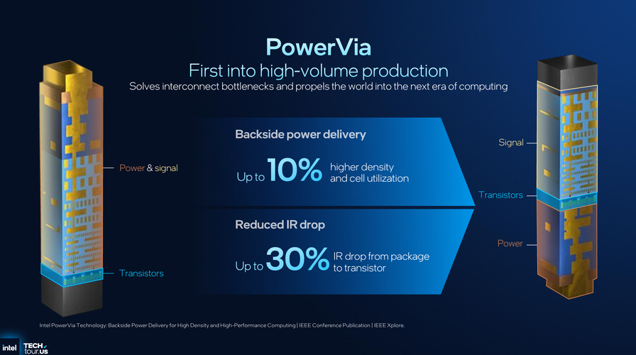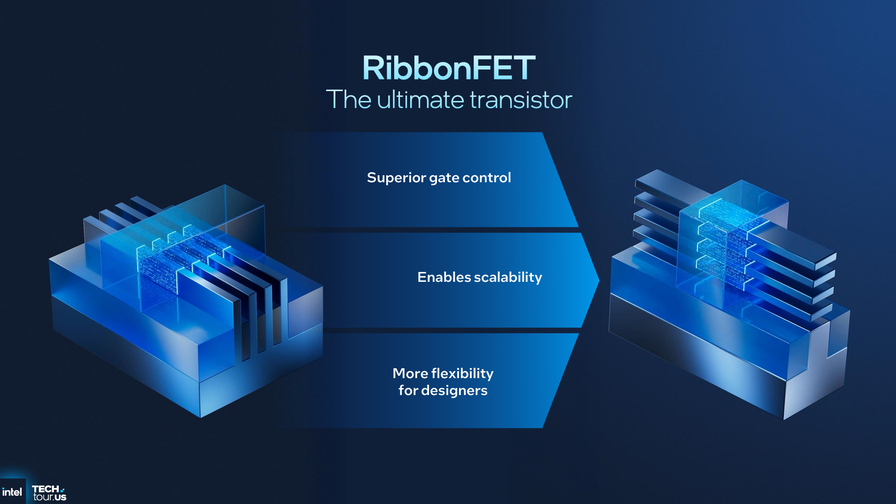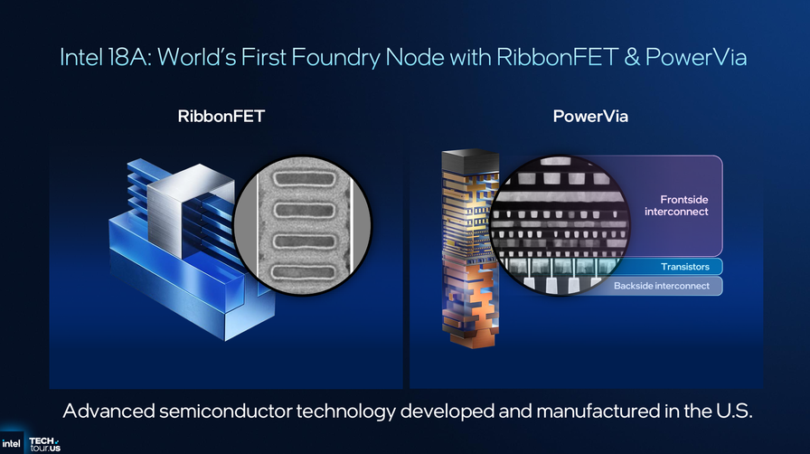 Sono molte le tecnologie impiegate da Intel per raggiungere il proprio obiettivo: oltre al nodo 18A, ci sono anche i nuovi transistor RibbonFET e l’uso di PowerVIA per l’alimentazione. RibbonFET offre un miglior controllo dei gate, è più scalabile grazie all’uso di fogli di silicio sovrapposti e da maggior flessibilità ai designer; PowerVIA permette di aumentare fino al 10% la densità e l’uso delle celle grazie al fatto che ora l’alimentazione arriva dal retro, inoltre assicura fino al 30% di IR Drop in meno dal package al transistor.