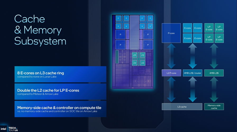 La memory-side cache da 8MB e il memory controller sono stati inoltre spostati dalla Platform tile alla Compute tile, per ridurre le latenze del fabric su working set ampi.