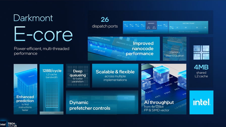 Gli E-core Darkmont puntano a prestazioni in linea con Raptor Cove (l’architettura di Raptor Lake) a potenze inferiori e introducono miglioramenti su nanocode, disambiguazione della memoria e deep queuing per scalare il parallelismo a consumi contenuti, oltre a più banda per la cache L2. Gli LPE-core sono anch’essi basati su architettura Darkmont e rimangono i core più efficienti all’interno di Panther Lake; in questa generazione godono di un aumento della cache L2 condivisa rispetto a Lunar Lake, che passa a 4MB.