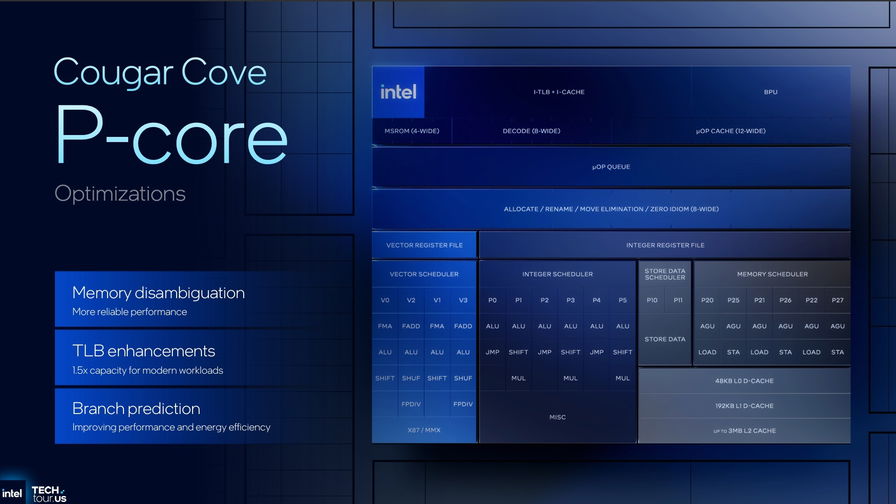 La Compute tile ora è prodotta con il processo Intel 18A e ci sono nuove architetture sia per i P-Core, basati su Cougar Cove, che per gli E-Core e gli LPE-Core, basati su Darkmont. Lato front-end, i P-core Cougar Cove integrano un refactor del Branch Prediction Unit (derivato e migliorato rispetto al BPU “novel” di Lunar Lake), TLB con 1,5 volte la capacità in più così da gestire workload moderni e disambigurazione della memoria, per prestazioni più affidabili. Ci sono poi 18 execution port e fino a 18MB di cache L3, a seconda della configurazione.