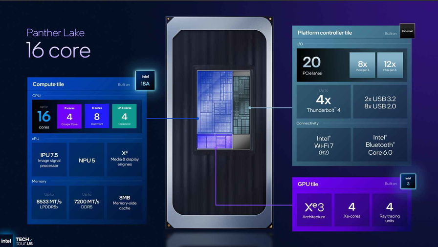 Panther Lake nasce per massimizzare l’efficienza a parità di prestazioni, scalare il throughput su CPU, grafica e AI e aumentare la flessibilità di prodotto, adattandolo alle diverse richieste del mercato; l’obiettivo di Intel è quello di unire l’efficienza di Lunar Lake e le prestazioni di Arrow Lake-H. Per raggiungere questo obiettivo viene riproposta la struttura a tile vista con Lunar Lake: la base fisica è il packaging Foveros-S 2.5D con fabric scalabile di seconda generazione che collega Compute tile, GPU tile (separato per scalare i segmenti) e Platform Controller tile (PCD), mantenendo un sistema coerente cross-tile e interconnessioni die-to-die dedicate.