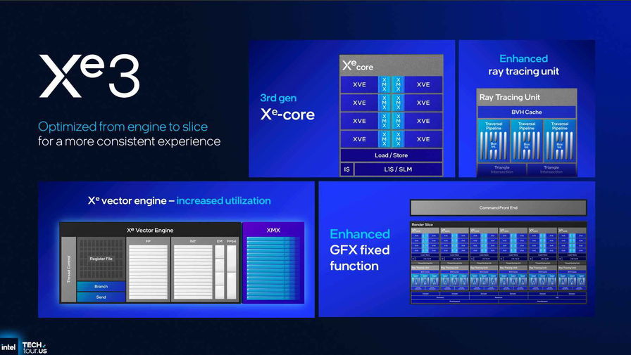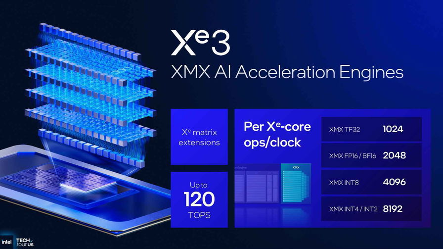 Ovviamente i miglioramenti sono merito della nuova architettura, che offre 6 render core (e 6 unità ray tracing) per render slice rispetto ai 4 di Lunar Lake, per una maggior scalabilità, oltre a nuovi Xe Core con 8 vector engine da 512 bit che offrono fino al 25% di thread in più e il supporto alla dequantizzazione FP8, 8 XMX engine da 2048 bit capaci di arrivare fino a 120 TOPS, il 33% in più di cache L1 condivisa per SLM e nuove unità ray tracing con dynamic ray management, per la gestione asincrona del ray tracing.