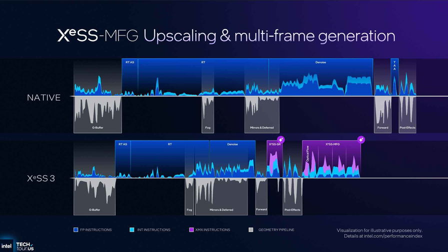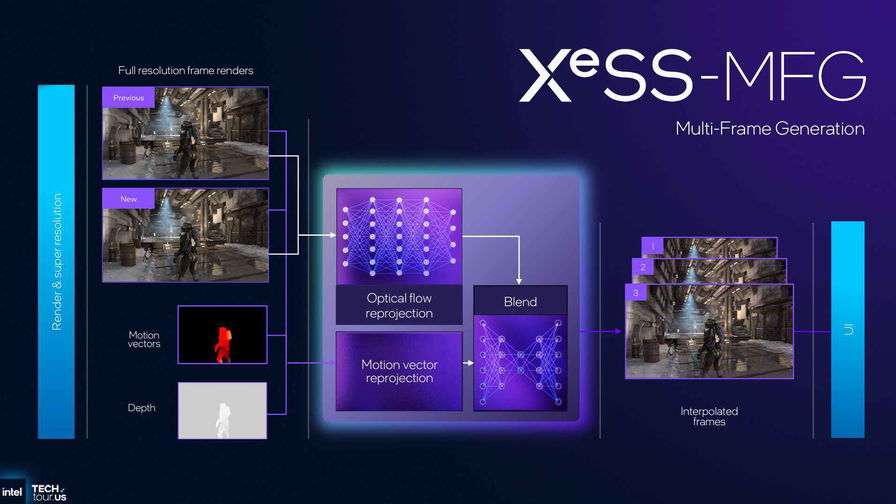 Una delle novità più importanti per la grafica di Panther Lake arriva dal software: per migliorare le prestazioni su piattaforme a basso consumo non basta una GPU potente, ma serve un approccio di rendering ibrido che mischia l’IA e la rasterizzanzione classica. Partendo da questo presupposto, che di fatto sta alla base di tutti gli upscaler, non solo XeSS, l’azienda ha sviluppato una nuova versione del suo algoritmo, che ora integra la generazione multipla di frame.