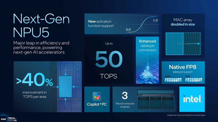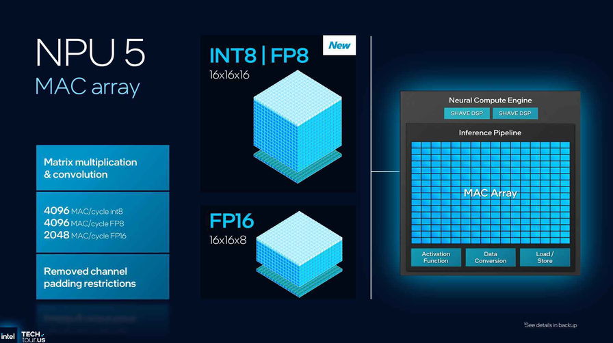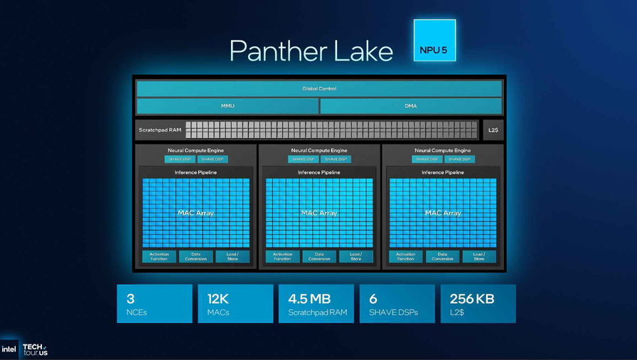 Il blocco NPU di 5ª generazione migliora per efficienza per area (+>40% TOPS/mm²), nonostante l’uso di 3 Neural Compute Engine contro i 6 di Lunar Lake, e amplia la copertura datatype con il supporto nativo per FP8 (E4M3/BF8 e E5M2/HF8), mantenendo INT8/INT4 e FP16/BF16. Il MAC array raggiunge 4096 MAC/ciclo in INT8 e in FP8, oltre a 2048 MAC/ciclo in FP16, rimuove restrizioni di channel padding e integra conversioni dati native con pipeline di post-processing FP32 e nuove LUT programmabili per molte funzioni di attivazione (ReLU, GELU, Tanh, ecc.).