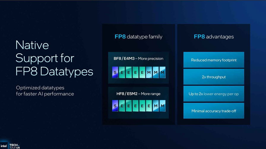 A livello di piattaforma, Intel dichiara fino a 180 TOPS per l’IA combinando CPU (fino a 10 TOPS con VNNI/AVX), NPU 5 (50 TOPS) e GPU Xe3 (120 TOPS), con particolari benefici in termini di energia e tempo su pipeline text-to-image passando da FP16 a FP8, dove si ottengono risultati qualitativamente simili ma più velocemente e consumando meno energia.