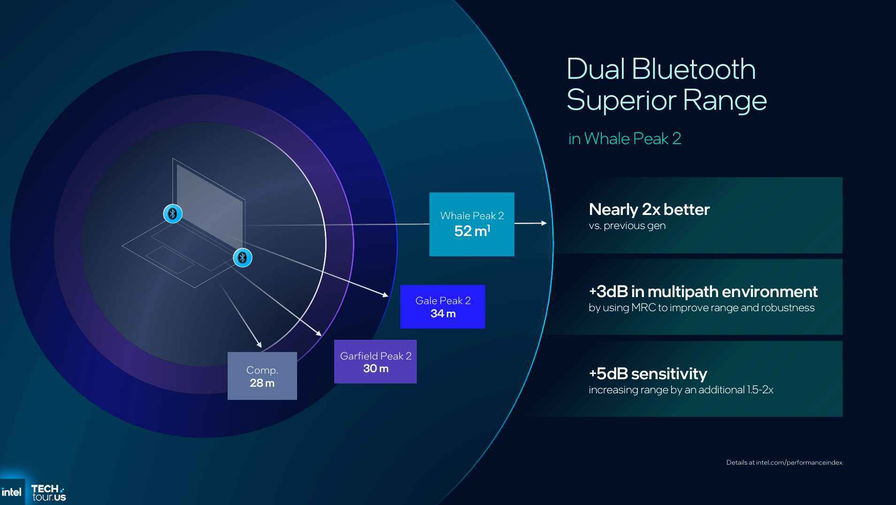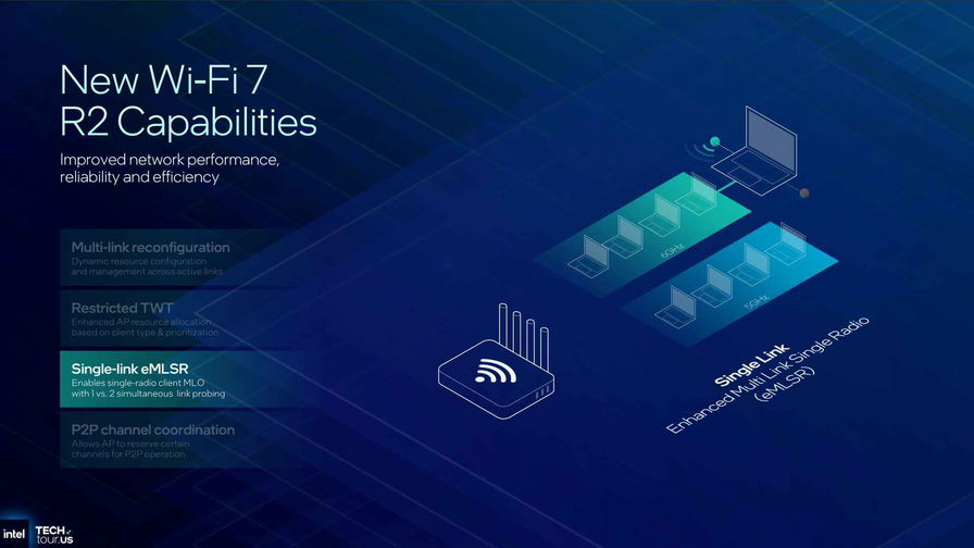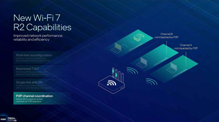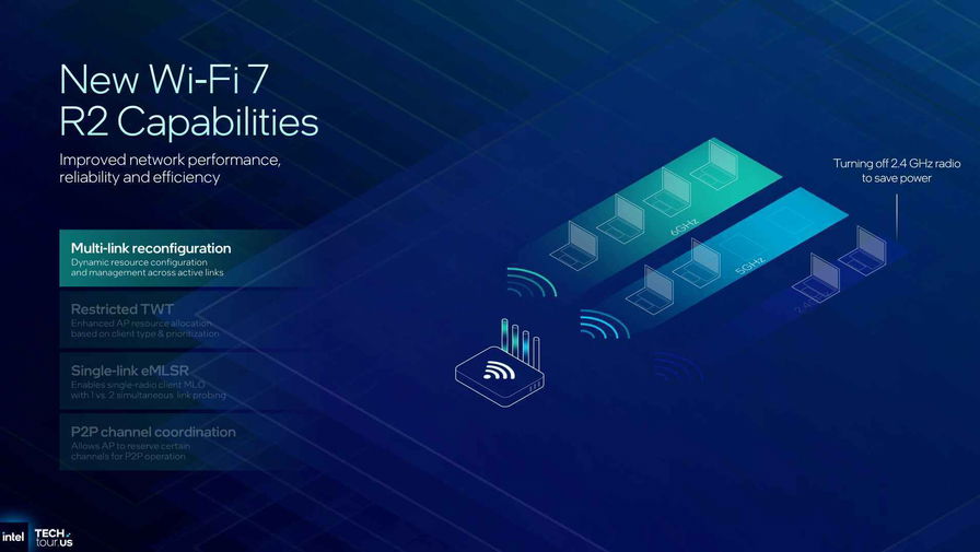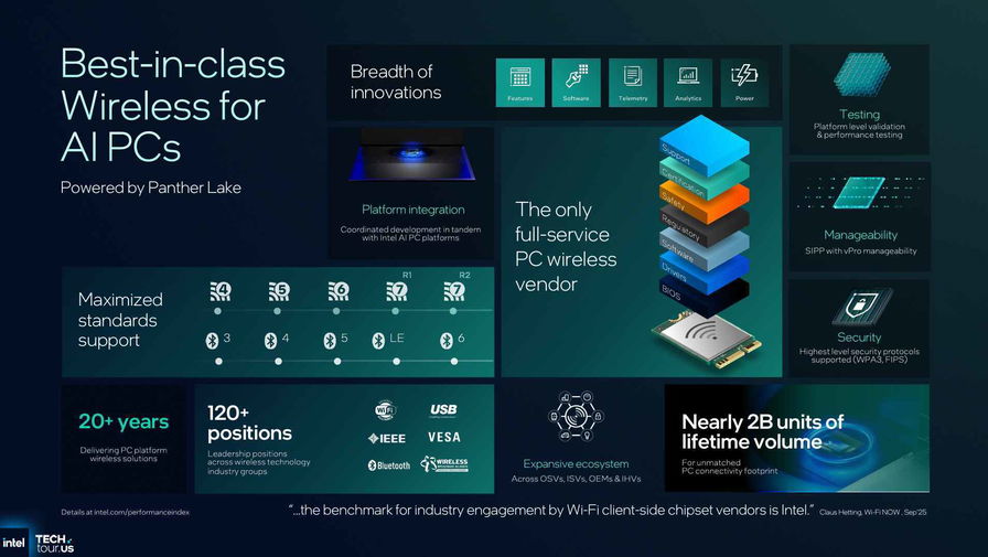 La nuova Platform tile integra Wi-Fi 7 Release 2 e Bluetooth Core 6.0: tra le novità principali del nuovo Wi-Fi troviamo single-link eMLSR (client MLO con una sola radio), multi-link reconfiguration e il coordinamento canali peer-to-peer per evitare interferenze con l’access point. Da notare inoltre che l’interfaccia CNVio 3 collega il modulo CRF al SoC a 11 Gbps, più del doppio rispetto a CNVio 2 che si fermava a 5 Gbps; si tratta di un requisito pratico per saturare la banda del Wi-Fi 7 integrato.