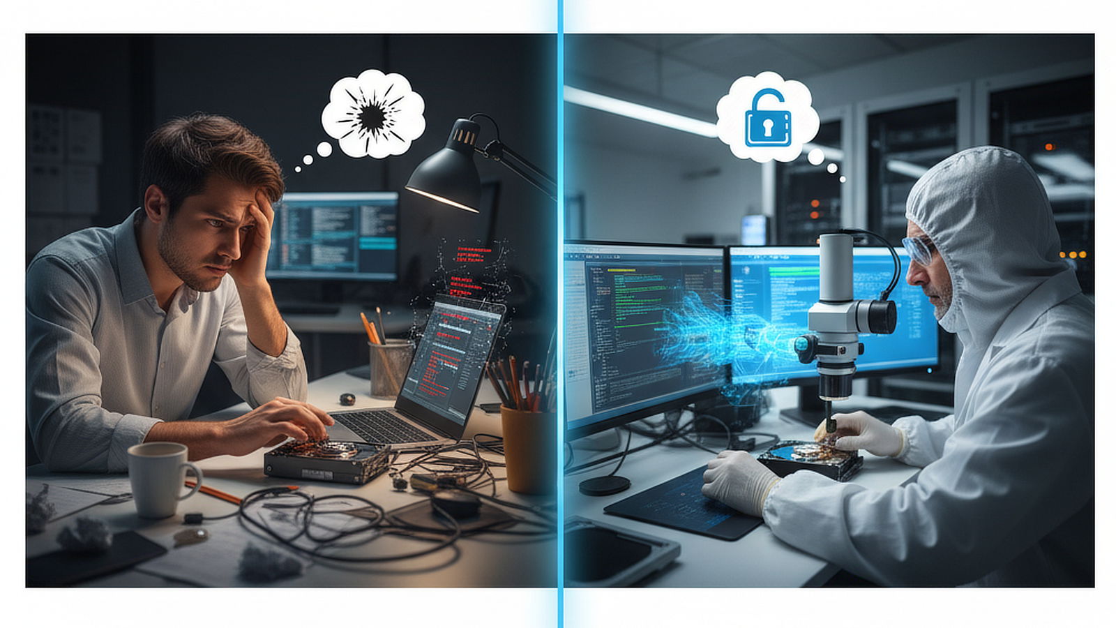Inoltre, il fai-da-te è ammissibile solo su dispositivi senza guasti hardware. Se sospettate un problema fisico (rumori dal disco, drive SSD non rilevato, telefono bagnato), non insistete con tentativi casalinghi: potreste aggravare irreparabilmente il danno. In caso di attacco ransomware, similmente, il fai-da-te è sconsigliato: strumenti di decrittazione improvvisati o web trovati online potrebbero fallire o peggiorare la situazione (es. alcuni ransomware cancellano i file se rilevano tentativi di forzatura).