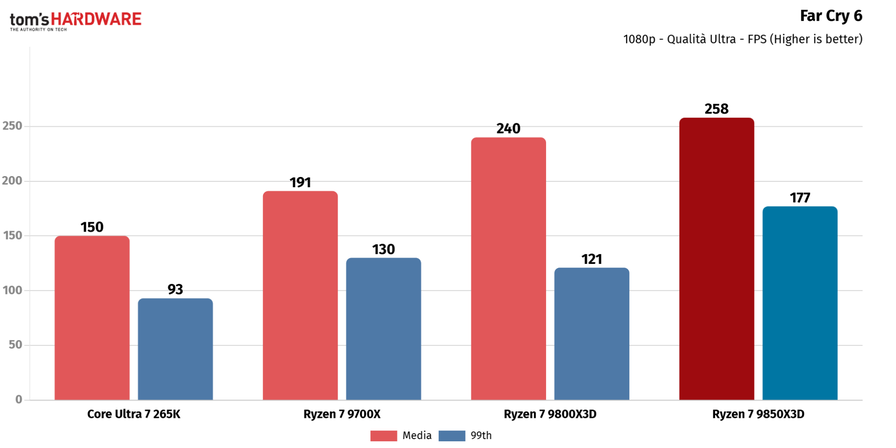 Rimane notevole anche il divario rispetto alla proposta Intel di questa fascia, il Core Ultra 7 265K: Dragon Age Veilguard è il gioco dove il distacco è minore, ma si attesta comunque sopra il 10%, mentre in Far Cry 6 arriva addirittura al 72%.