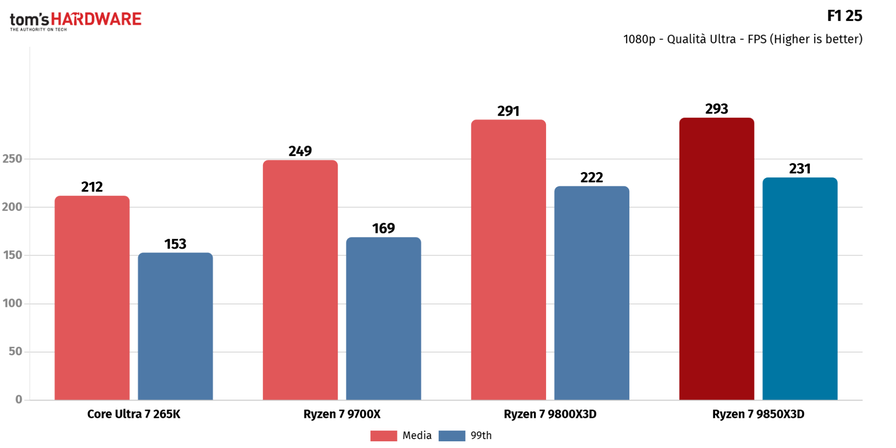 La frequenza maggiore aiuta anche a migliorare i risultati nel 99esimo percentile: lo vediamo soprattutto in Far Cry 6, F1 25, Dragon Age e Cyberpunk, dove il nuovo 9850X3D si comporta sensibilmente meglio degli altri.