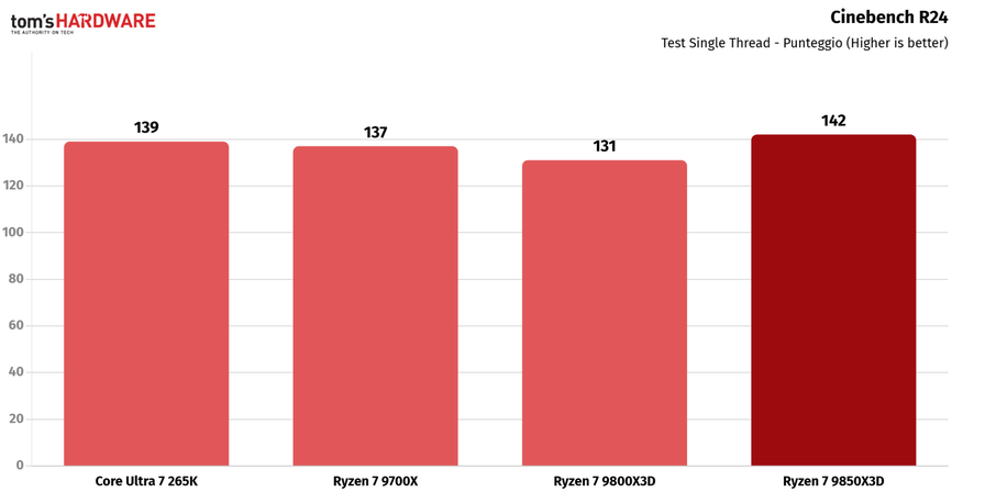 Il ryzen 7 9850X3D non brilla particolarmente sul fronte dei consumi, specialmente quando sotto stress: nel test multi-thread di Cinebench R24 fa registrare un consumo medio di 138,6 watt, non solo leggermente superiore al TDP nominale di 120 watt, ma il 50% in più rispetto al 9800X3D, che in questo test si ferma a 92 watt.
