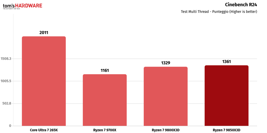 Spostandoci sulla produttività, il Ryzen 7 9850X3D mostra un comportamento solido, ma strettamente legato alla natura della sua configurazione a 8 core: nei test di puro calcolo multi-thread, come Cinebench R24 e Blender, il Core Ultra 7 265K grazie a un numero maggiore di core mantiene un vantaggio rispettivamente del 32% e del 28%.