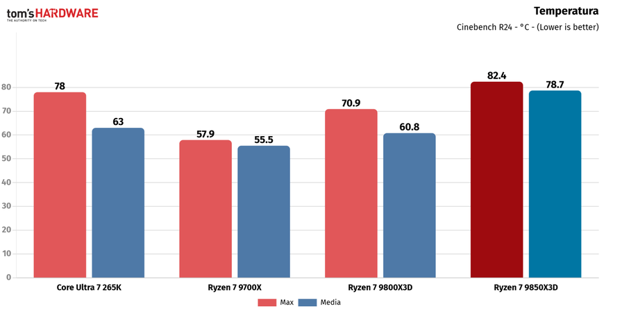Il processore non eccelle nemmeno guardando alle temperature: durante lo stress test con Cinebench R24, il 9850X3D tocca un massimo di 82,4°C, quasi 12°C in più del 9800X3D, che si ferma a 70,9°C. In gioco fa registrare invece una media di 67,4°C, risultando anche in questo caso decisamente più caldo del 9800X3D, che ha una media di 51,7°C.