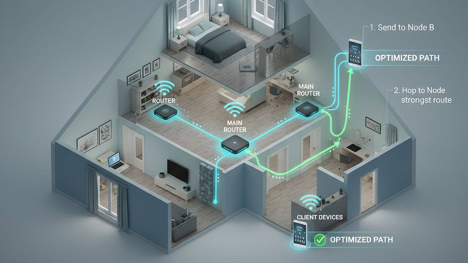 Questo meccanismo garantisce che il segnale copra distanze maggiori rispetto a una sola connessione diretta: se un nodo è fuori portata dal router principale, trasmette tramite uno o più nodi intermedi (multi-hop routing). Ad esempio, grazie ai protocolli mesh ogni router o repeater conosce la topologia di rete circostante e riesce a ricalcolare all’istante un percorso alternativo se quello ottimale cambia (es. a causa di ostacoli o congestione).
