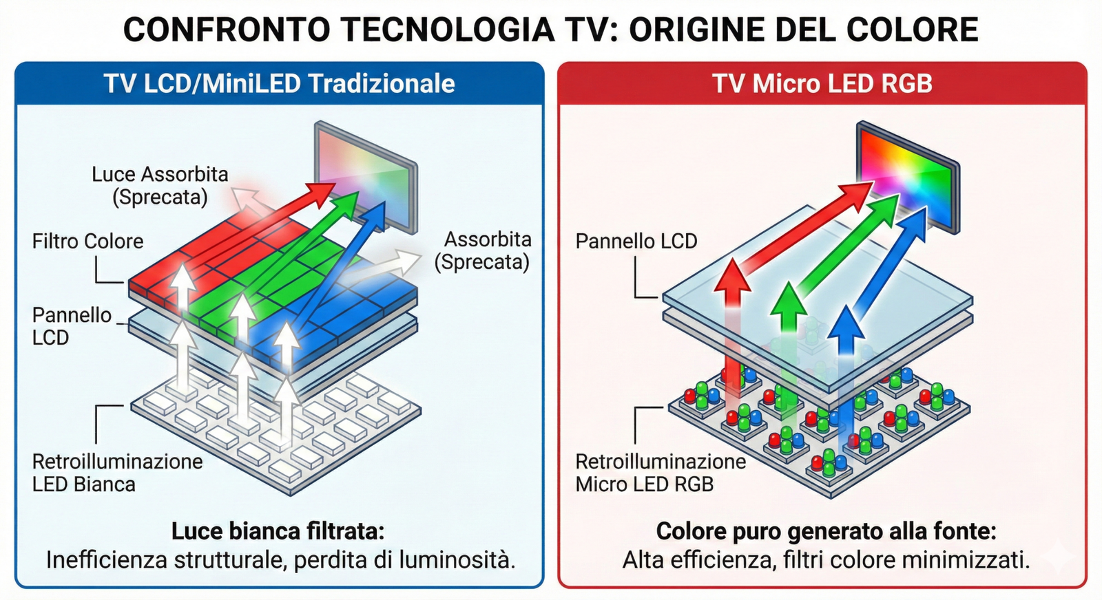 Questo processo, per quanto collaudato e funzionale, porta con sé un’inefficienza strutturale poiché parte della luce viene inevitabilmente assorbita dai filtri colore, venendo di fatto sprecata. Una TV RGB cambia radicalmente questo paradigma: invece di partire da una sorgente luminosa bianca da modificare successivamente, il colore viene generato puro direttamente alla fonte.