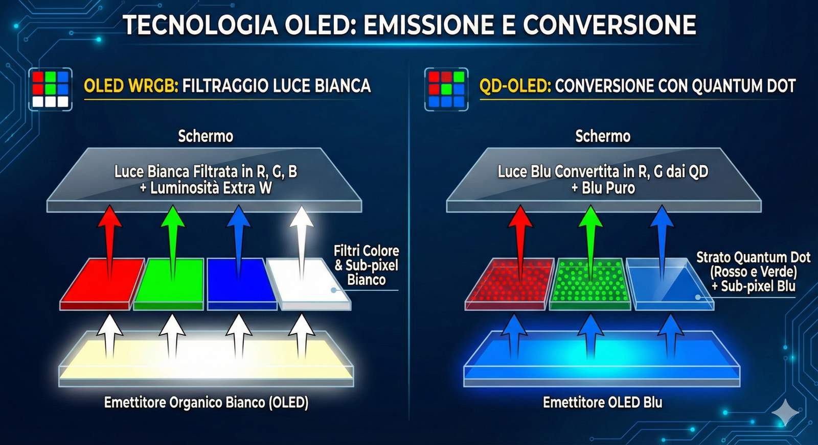 In realtà il punto in cui la somiglianza finisce è proprio lì, nel colore, mentre il modo in cui quell’RGB viene usato è diverso. Negli OLED il pixel è auto-emissivo, il che significa che ogni singolo pixel sullo schermo produce direttamente la luce che vedi. Nei pannelli OLED più diffusi oggi, la luce nasce da materiali organici che emettono luce quando attraversati da corrente elettrica. Nei sistemi WRGB la base è una luce bianca organica, che viene poi filtrata in rosso, verde e blu a livello di sub-pixel, con l’aggiunta di un sub-pixel bianco per aumentare la luminosità, mentre nei QD-OLED la luce di partenza è blu e viene convertita in rosso e verde tramite quantum dot.