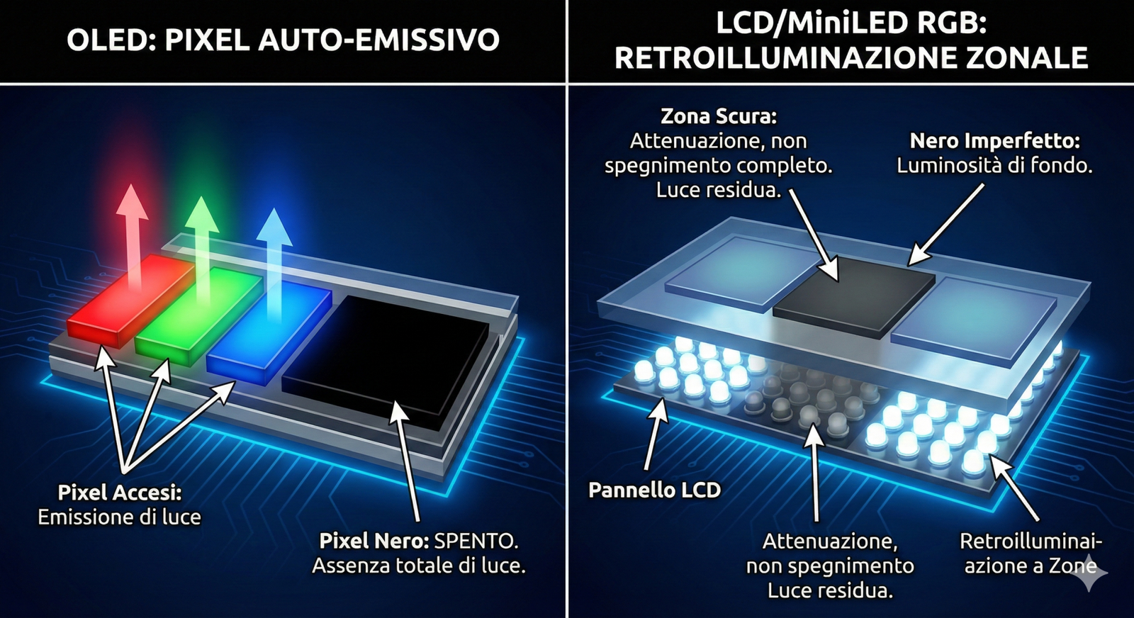 Questo significa che l’unità fondamentale di controllo non è il singolo pixel, ma una zona di retroilluminazione, più o meno piccola a seconda dell’implementazione. C’è poi un’altra distinzione cruciale. Negli OLED, se un pixel deve essere nero, semplicemente non emette luce e il nero è assenza totale di emissione. In una TV RGB, invece, anche quando una zona deve essere scura, esiste sempre una sorgente luminosa dietro al pannello, che viene attenuata o spenta a livello di zona, ma mai con la stessa granularità del singolo pixel.