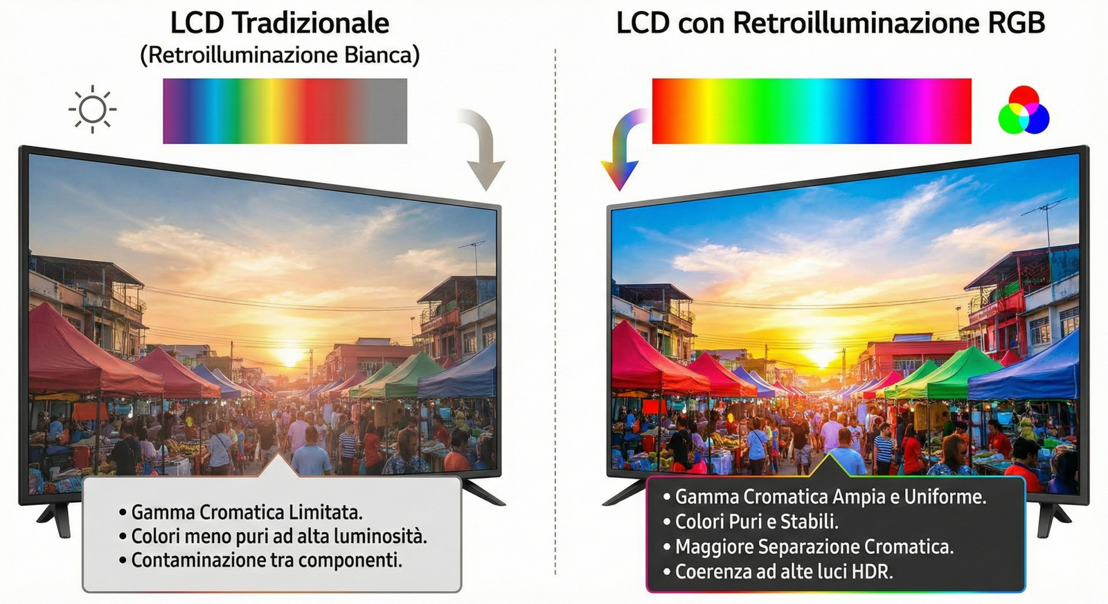 Il passaggio da una retroilluminazione LCD classica a una RGB non cambia la natura del pannello, ma modifica l’immagine, e la prima differenza evidente riguarda il colore.