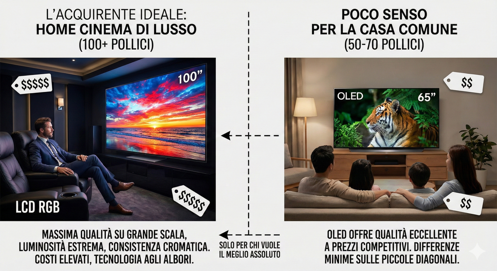 Partiamo con il dire che in questo momento siamo agli albori di questa tecnologia, ciò significa che i costi sono molto elevati. Considerando che le differenze si possono vedere principalmente sulle grandi diagonali, quindi attorno ai 100 o più pollici, dove è possibile raggiungere una luminosità molto elevata e una consistenza cromatica superiore e dove gli OLED ancora non arrivano in termini proprio di dimensioni, direi che è proprio questa l’applicazione più sensata per chi vuole una TV molto grande con una qualità d’immagine qualitativamente molto elevata, se non la migliore che si possa avere. Per le dimensioni più piccole, quindi quelle classiche delle nostre case dai 50 ai 70 pollici, probabilmente ha poco senso scegliere queste TV, almeno finché i prezzi non si abbasseranno ai livelli degli OLED.