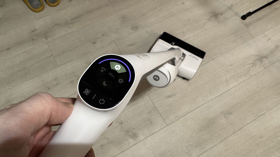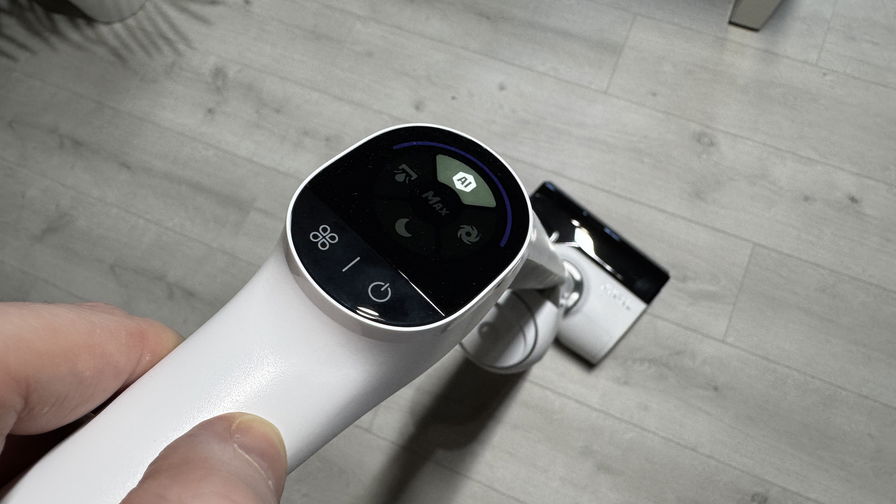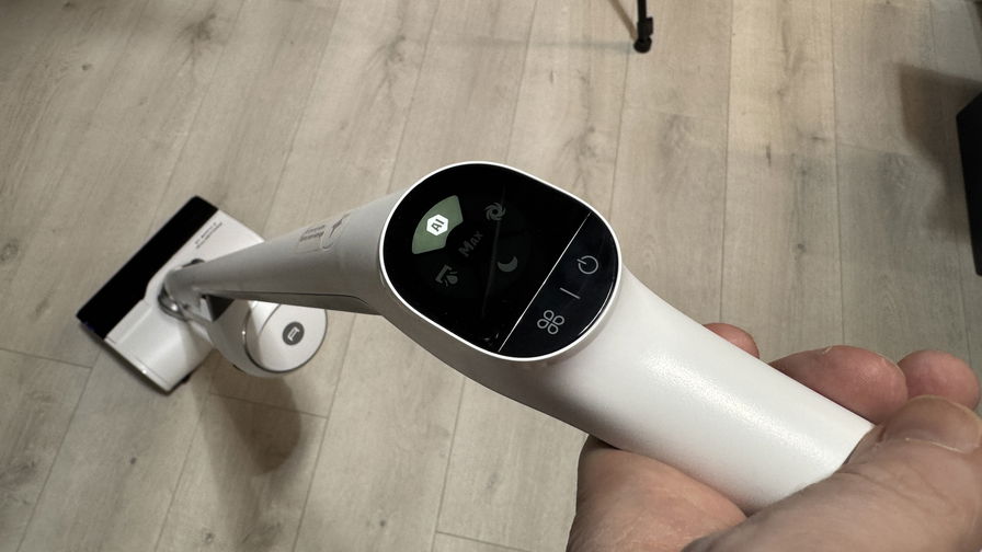 L'interfaccia utente è costituita da un display LED posto sulla parte superiore dell'impugnatura, che mostra informazioni essenziali come la modalità di pulizia selezionata, lo stato della batteria e eventuali avvisi di manutenzione. Il dispositivo è dotato anche di un assistente vocale che fornisce feedback durante l'utilizzo, informando l'utente su cambi di modalità o necessità di intervento. La navigazione tra le diverse opzioni avviene tramite pulsanti fisici facilmente accessibili durante l'uso.