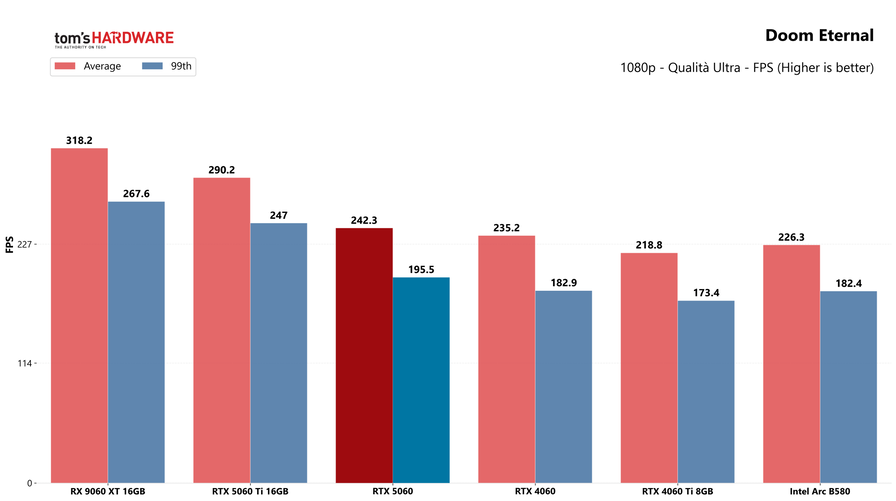 La RTX 5060 si posiziona in una fascia intermedia ben definita: in media è circa il 17% più veloce della RTX 4060, con punte che sfiorano il +30% in titoli come Cyberpunk 2077 e Doom Eternal. Rimane invece mediamente dietro del 15% alla RTX 5060 Ti, con differenze più marcate in titoli come Dragon Age Veilguard e Returnal.