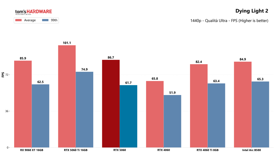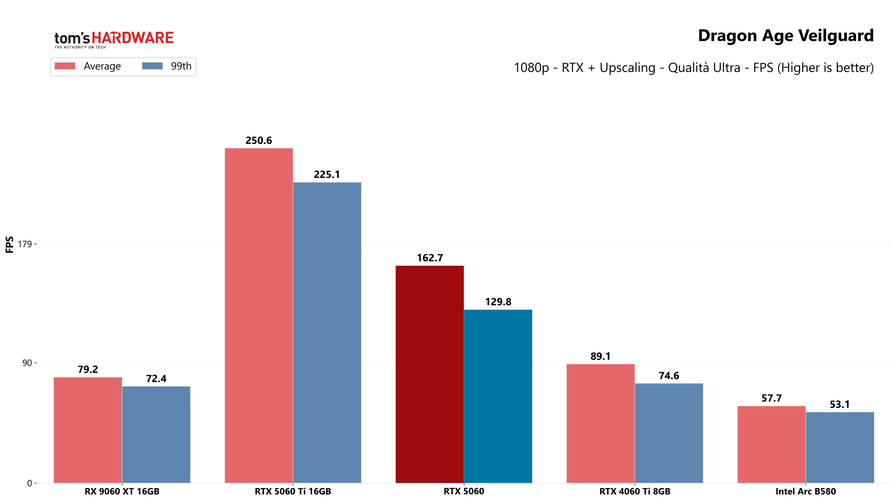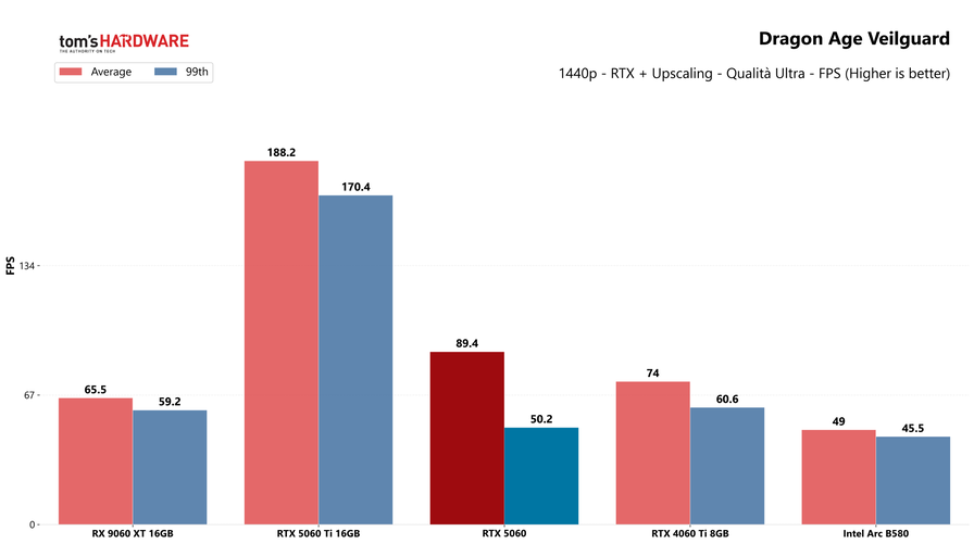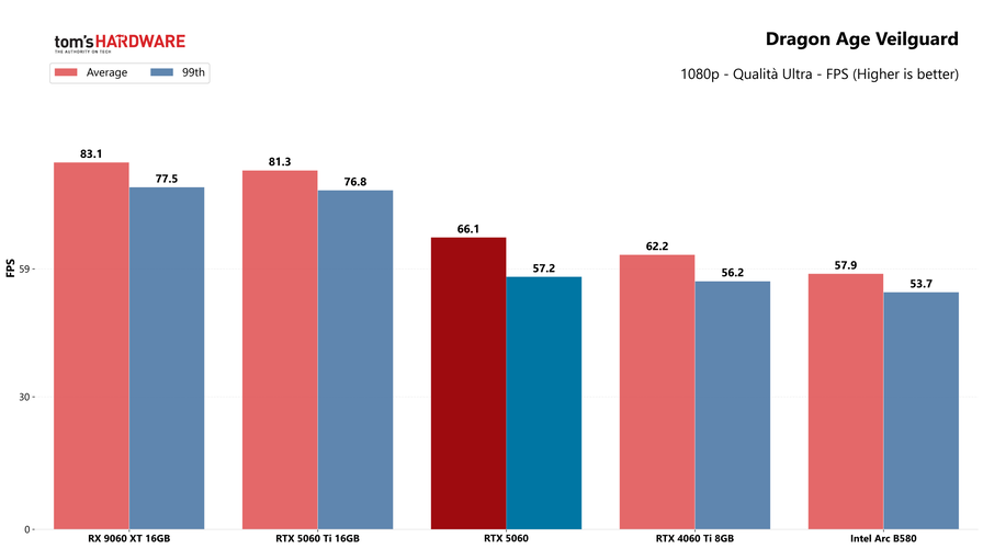 A prima vista la RTX 5060 potrebbe sembrare una GPU valida per la fascia in cui si posiziona, dato che offre buone prestazioni anche in 1440p nei titoli meno impegnativi, dove gli 8GB di VRAM non sono un limite. Il problema, però, è che con i giochi moderni mostra il fianco anche in Full HD, risoluzione dove ci aspettiamo non abbia problemi, anche a dettagli massimi. In Dragon Age Veilguard il framerate medio è solo una manciata di FPS sopra la soglia critica dei 60 FPS, mentre il 99esimo percentile è perfino sotto, segno che se si vuole davvero giocare sempre, stabilmente sopra i 60 frame al secondo, bisogna abbassare leggermente i dettagli.