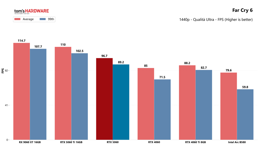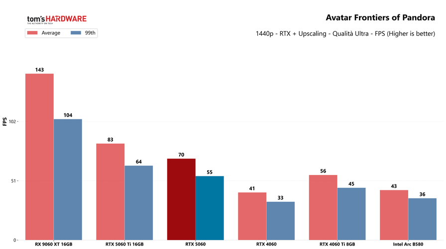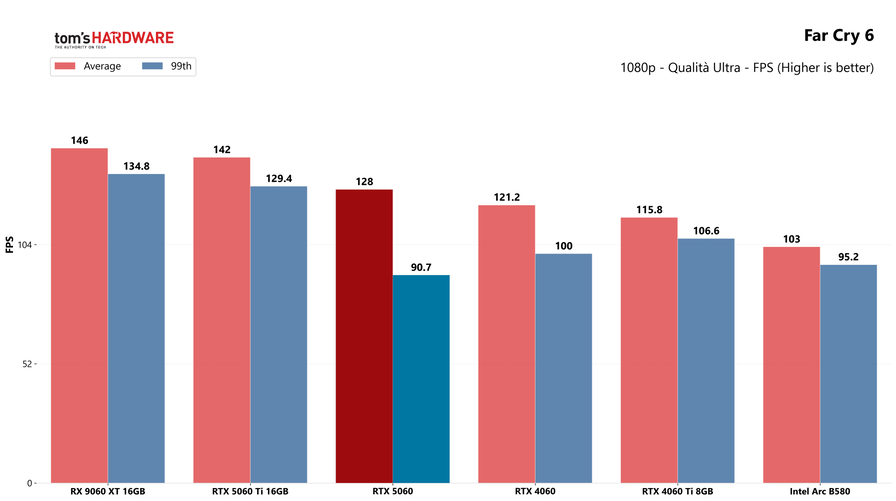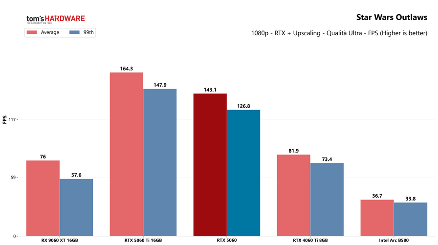 Il distacco con la RTX 5060 Ti è netto, la sorella maggiore si conferma una scheda di fascia superiore che non viene impensierita dalla nuova arrivata, grazie anche al maggior quantitativo di memoria. Esiste anche una RTX 5060 Ti da 8GB, ma come già ripetuto in altre occasioni, non ve la consigliamo: se siete interessati, puntate sempre al modello con 16GB di memoria video.