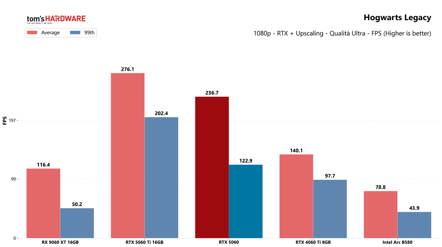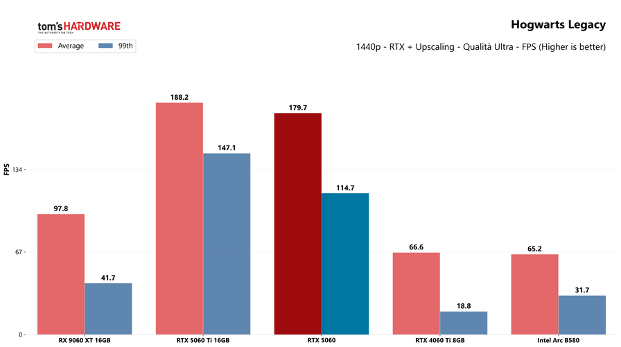 Con il ray tracing attivo e il DLSS abilitati, la RTX 5060 riesce spesso a raddoppiare o triplicare le prestazioni della RTX 4060, grazie come sempre alla Multi-Frame Generation: in Cyberpunk 2077 si passa da 73 FPS medi con la 4060 a 147 FPS con la 5060 (+100%), mentre in Hogwarts Legacy il margine supera addirittura il +170%. Rispetto invece alla RTX 5060 Ti, la scheda è mediamente più lenta del 25%, con distacchi importanti in giochi come Dragon Age Veilguard (-52%) e Returnal (-31%), ma molto più ridotti in altri, come Hogwarts Legacy (-5%).