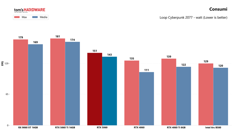 Sul fronte dell’efficienza energetica, in Cyberpunk 2077 la scheda fa registrare un consumo medio di circa 143 W, inferiore a quello della 5060 Ti (174 W) e solo leggermente più alto rispetto alla RTX 4060 (111 W), oltre che perfettamente in linea con il TDP di 145 watt.