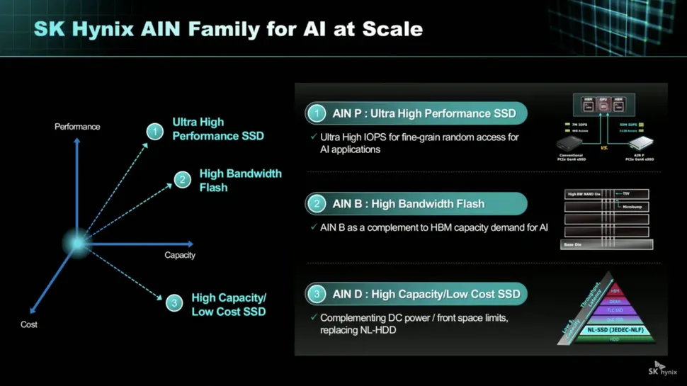 La famiglia AIN D, dove la D sta per Density, punta a sostituire gli hard disk nearline tradizionali sfruttando memorie 3D QLC NAND. Questa soluzione promette di raggiungere capacità dell'ordine dei petabyte, ben oltre i terabyte degli SSD attuali, mantenendo al contempo i vantaggi tipici delle unità a stato solido come tempi di accesso rapidi e throughput elevato. Il costo per bit risulterebbe il più basso possibile nell'ambito delle memorie flash NAND, rendendo economicamente sostenibile l'archiviazione di dataset AI di dimensioni massicce.