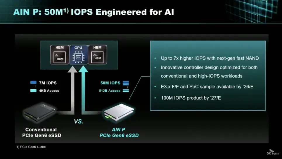 Sul fronte delle prestazioni pure si posiziona invece AIN P, pensato specificamente per le applicazioni di inferenza AI. Secondo quanto dichiarato da Chunsung Kim, vicepresidente di SK hynix, i campioni degli SSD AIN P dovrebbero raggiungere circa 50 milioni di IOPS con granularità di 512 byte utilizzando un'interfaccia PCIe 6.0. Si tratterebbe di prestazioni sette volte superiori rispetto agli SSD enterprise PCIe Gen6 convenzionali. L'azienda ha anche annunciato l'obiettivo di arrivare a 100 milioni di IOPS entro il 2027, anche se raggiungere tale cifra richiederebbe probabilmente configurazioni PCIe 6.0 x8 o x16, o in alternativa PCIe 7.0 x4.