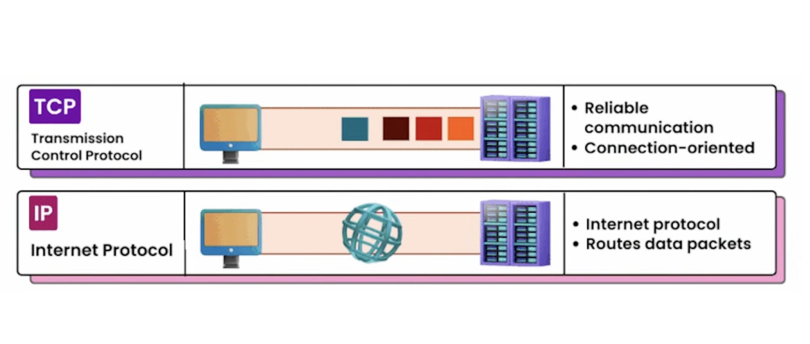 Il protocollo IP gestisce gli indirizzi, assegnando a ogni pacchetto la provenienza e la destinazione. Il protocollo TCP, d'altro canto, assicura che tutti i pacchetti arrivino effettivamente e nell'ordine giusto.