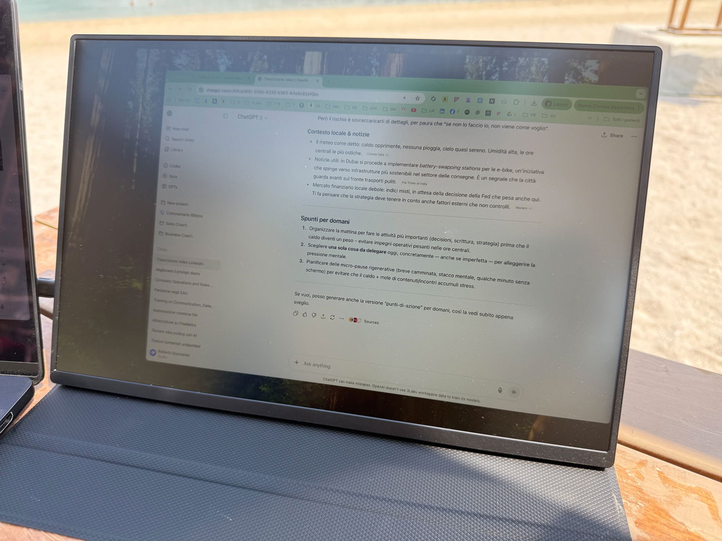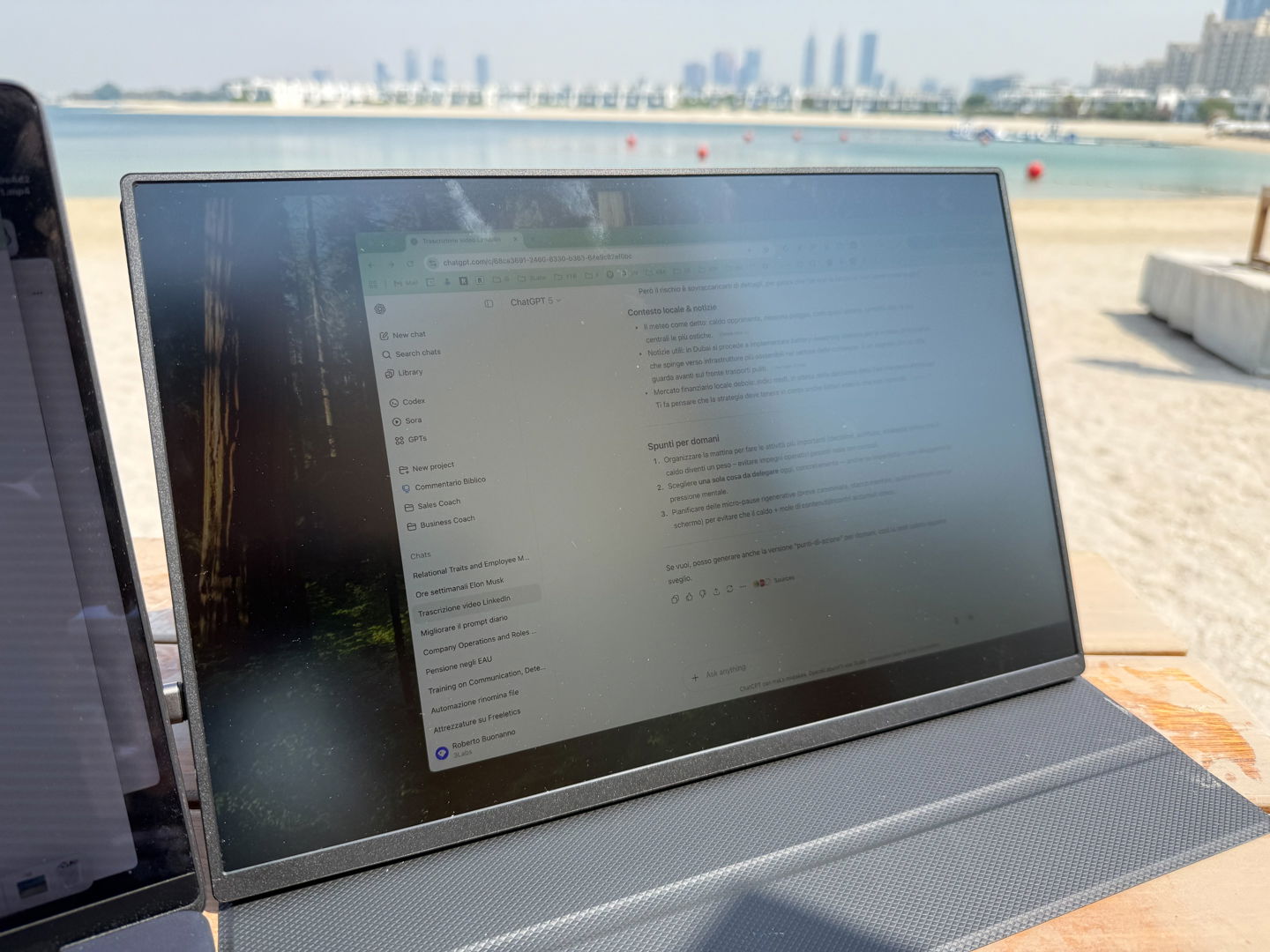 L'UPERFECT UColor T6 è un display portatile versatile e pratico grazie alle dimensioni compatte e al peso inferiore al chilo. Potrete portarlo sempre nello zaino, per poter lavorare in mobilità senza rinunciare a un pratico setup con doppio schermo. Mantiene la promessa di essere leggibile alla luce del giorno, risultando molto più chiaro e facile da leggere rispetto a uno schermo standard di laptop in pieno sole. Ovviamente nel nostro esempio estremo in spiaggia, assolutamente teorico, il problema era il surriscaldamento delle parti e i potenziali danni della sabbia, quindi sconsigliamo di riprodurre quelle condizioni a chi tiene ai propri dispositivi!